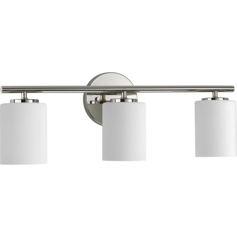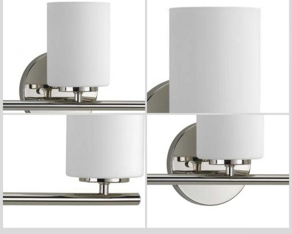 Ideal for a bathroom;Perfect for modern and transitional style settings;Subtle polished nickel finish;Elegant etched painted white glass shades;Mount the light fixture facing up or down;Use 3 medium base bulbs that are sold separately (100 W max - LED/CFL/