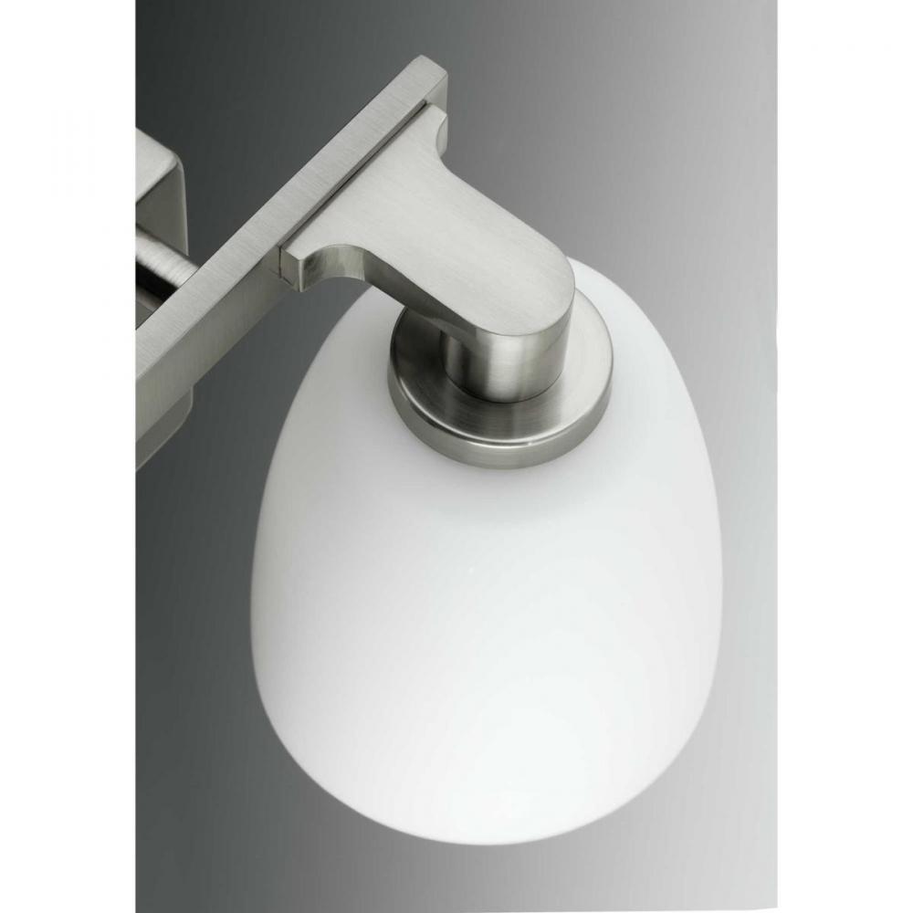 The three-light bath fixture emulates European faucet designs. Fleet is compromised of a distinct die cast arm and cup and highlighted by etched opal glass. Complimented by a Brushed Nickel finish.