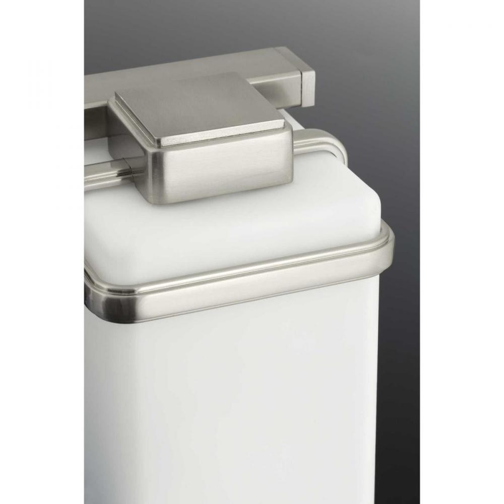Enjoy a cool and sleek modern design with the three-light bath & vanity in the Metric Collection. A simple, etched opal glass shade nestles inside a die-cast frame - that is finished in Brushed Nickel - providing light above and below the fixture.