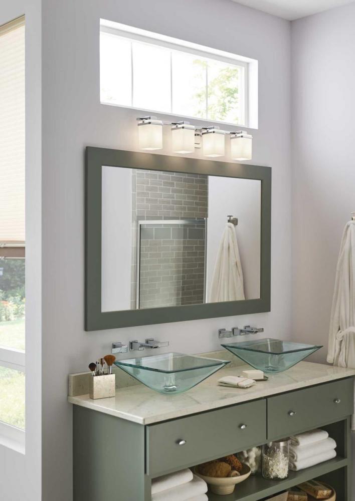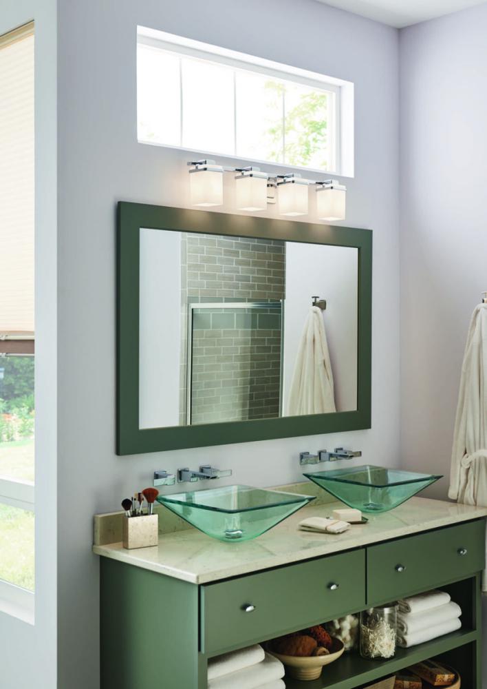 Enjoy a cool and sleek modern design with the four-light bath & vanity in the Metric Collection. A simple, etched opal glass shade nestles inside a die-cast frame - that is finished in Polished Chrome - providing light above and below the fixture.