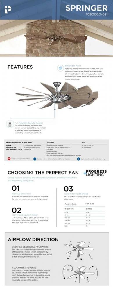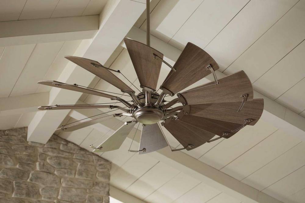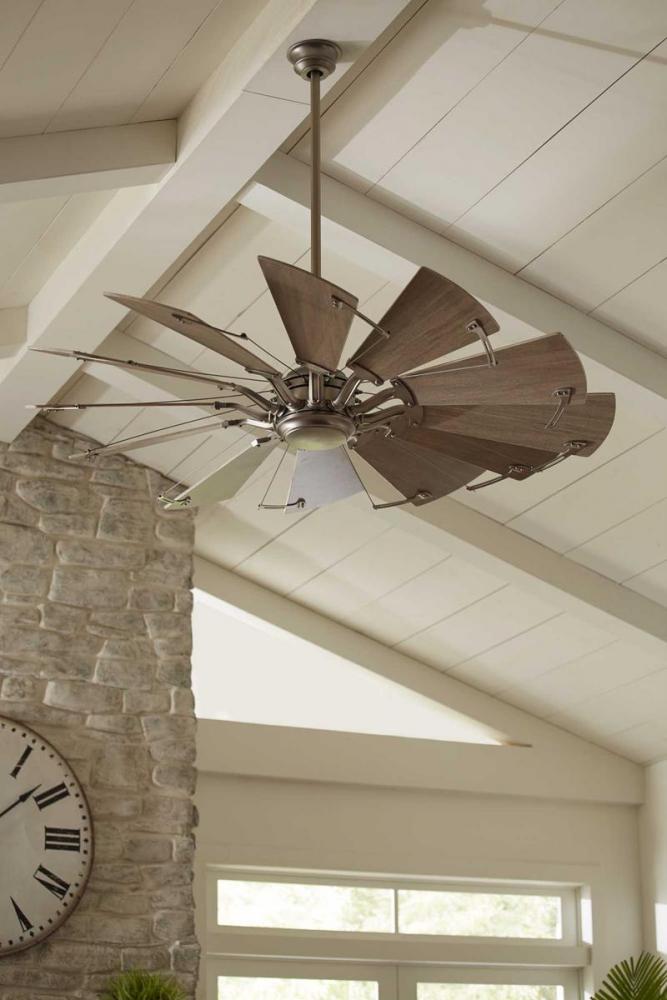 12-blade, 60” statement-making ceiling fan was inspired by the form and function of a windmill;Powerful and quiet DC Motor;Features White Barnwood finished blades;Springer ceiling fan with Antique Nickel finish and White Barnwood blades;Beautiful and exp