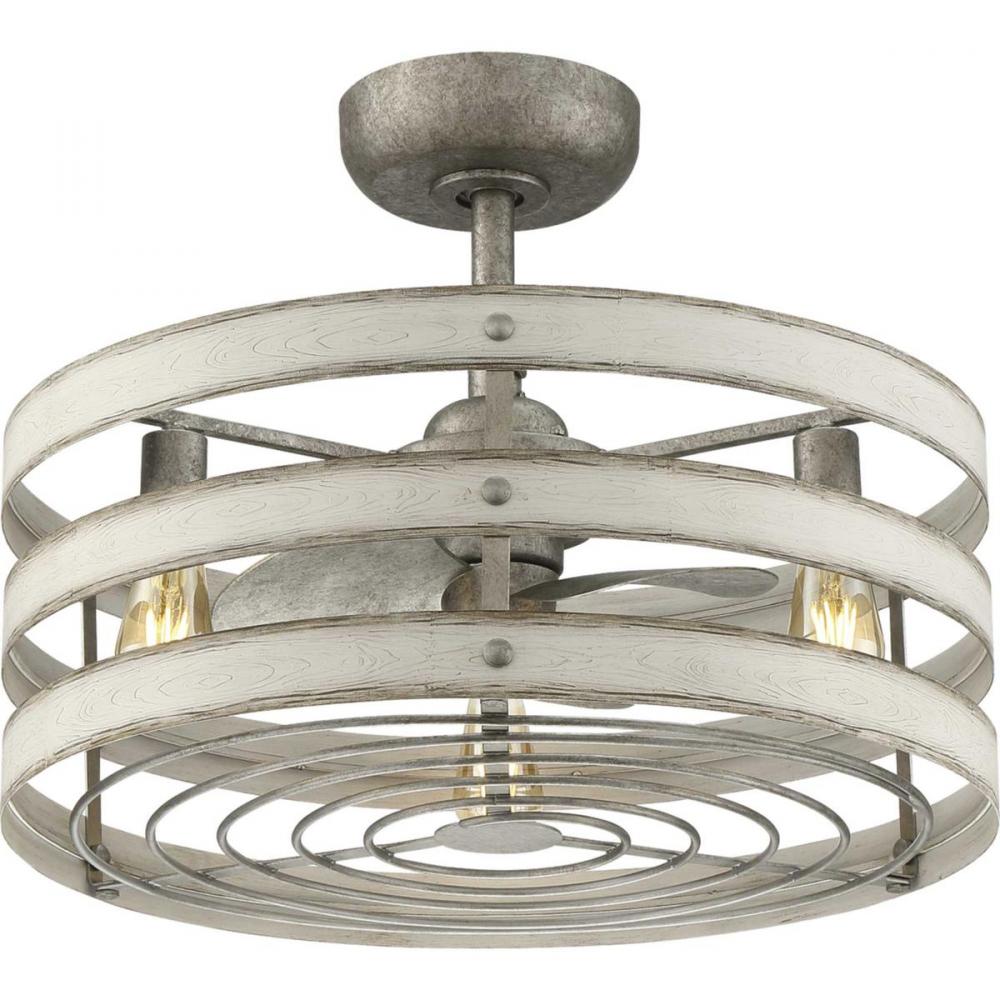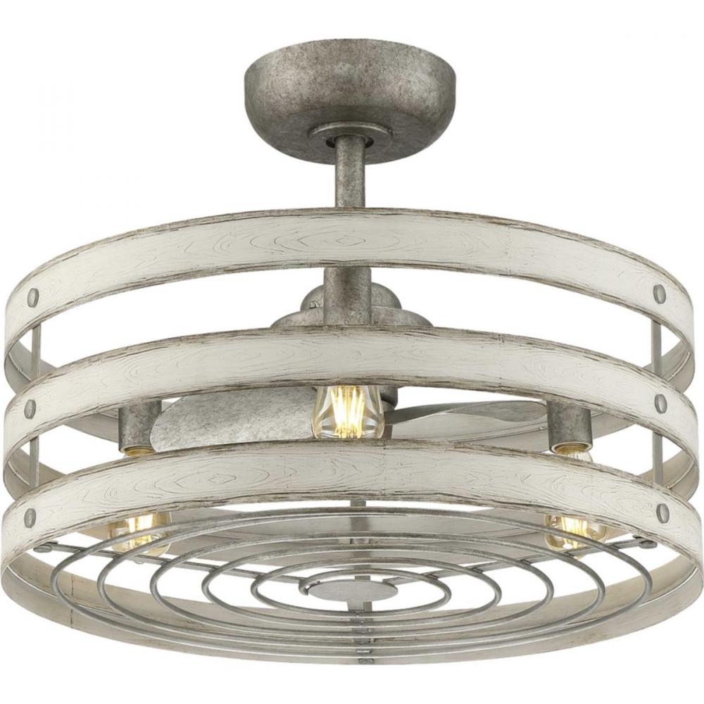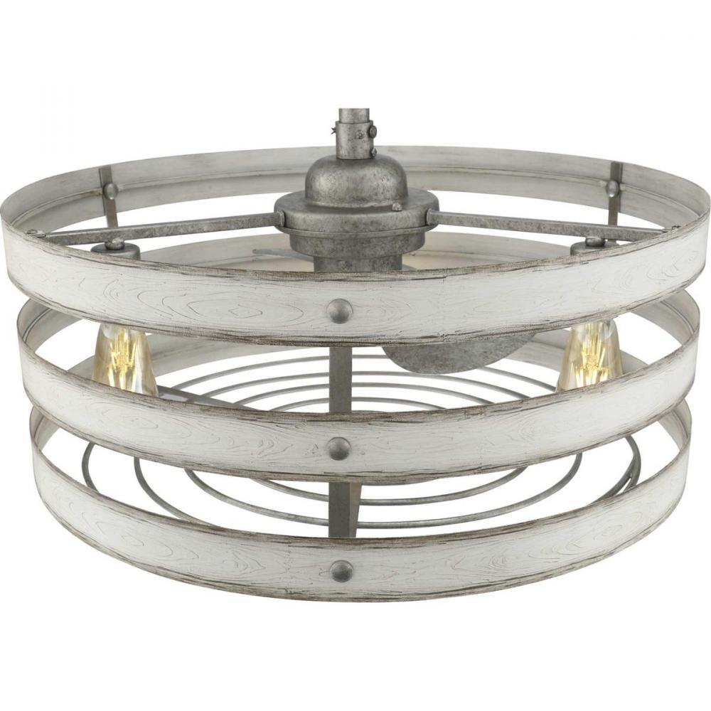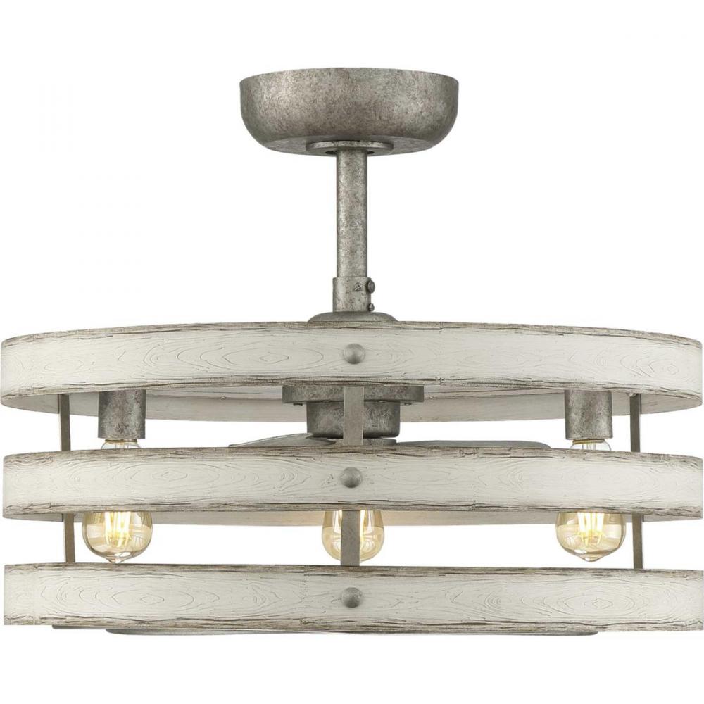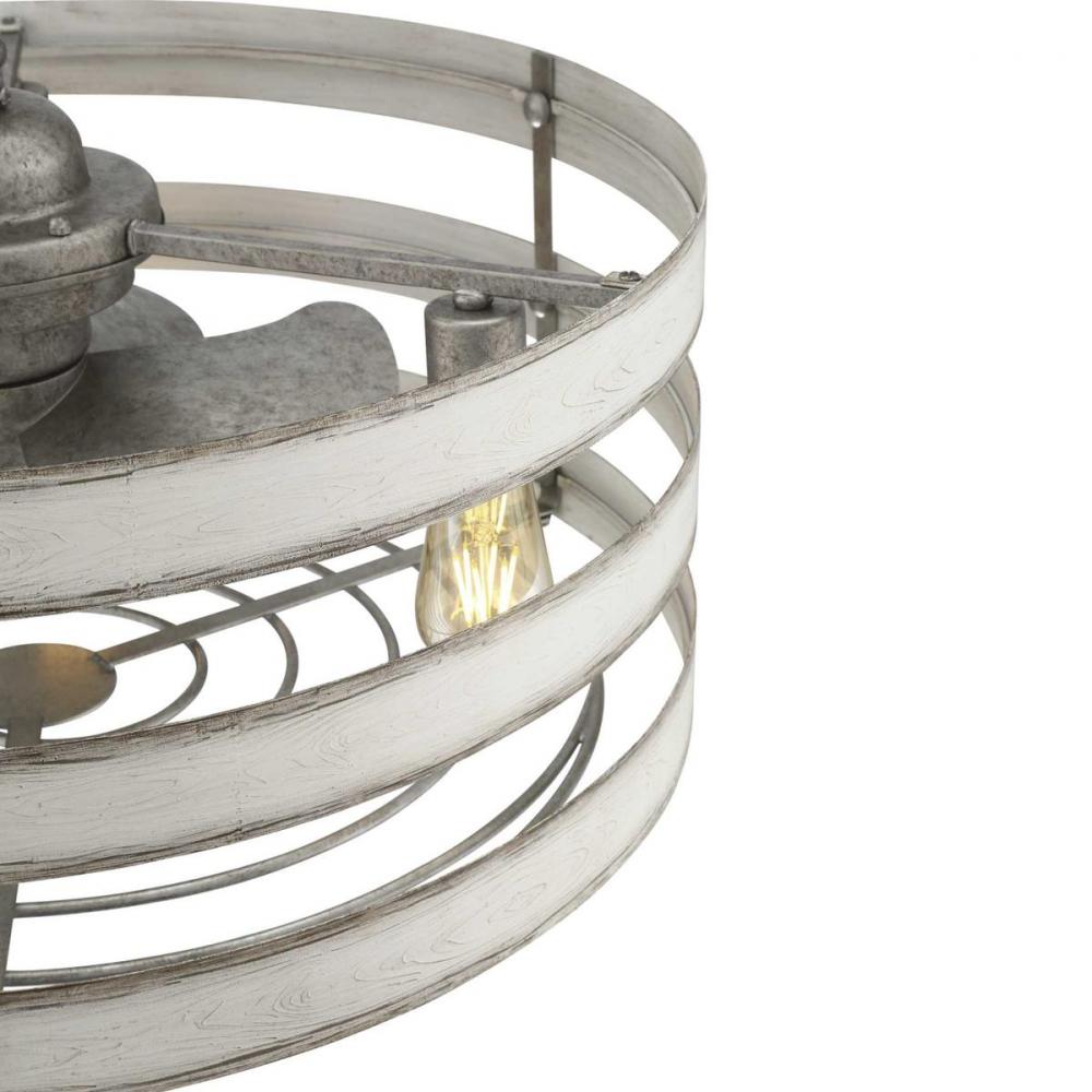 Simultaneously cool and illuminate your farmhouse or seaside home with the Gulliver ceiling fan. Three Antique White Wood bands wrap together to create a rustic, open-cage design that offers style while generating a revitalizing, cool breeze.