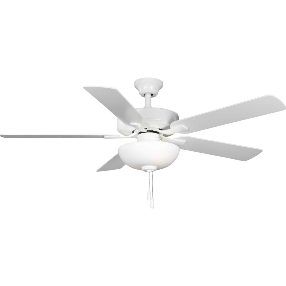 The AirPro 52” 5-blade ceiling fan refreshes interiors with a sleek, modern form coated in a crisp White finish. Five clean-lined fan blades extend outward from a streamlined motor housing that contains a powerful AC motor. Its versatile yet timeless design makes it ideal for a wide range of interior décor styles. The fan has an AC motor and is rated for maximum efficiency. A Unipack option packages the light kit so that it ships with the fan, eliminating both the need to order the light kit separately and having the light kit shipped separately from the fan. A shatterproof white Frosted polypropylene dome shade offers durability and optimal, even illumination. Two medium based LED lamps (8.5-Watt, 80CRI, 3000K) are included. An accessory wall and remote control can be added (sold separately). The fan can be installed on a flat or sloped ceiling. The blade arms have Captive Screws allowing for easier installation.