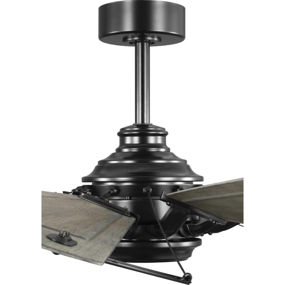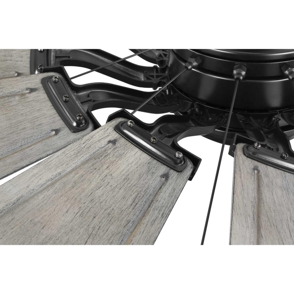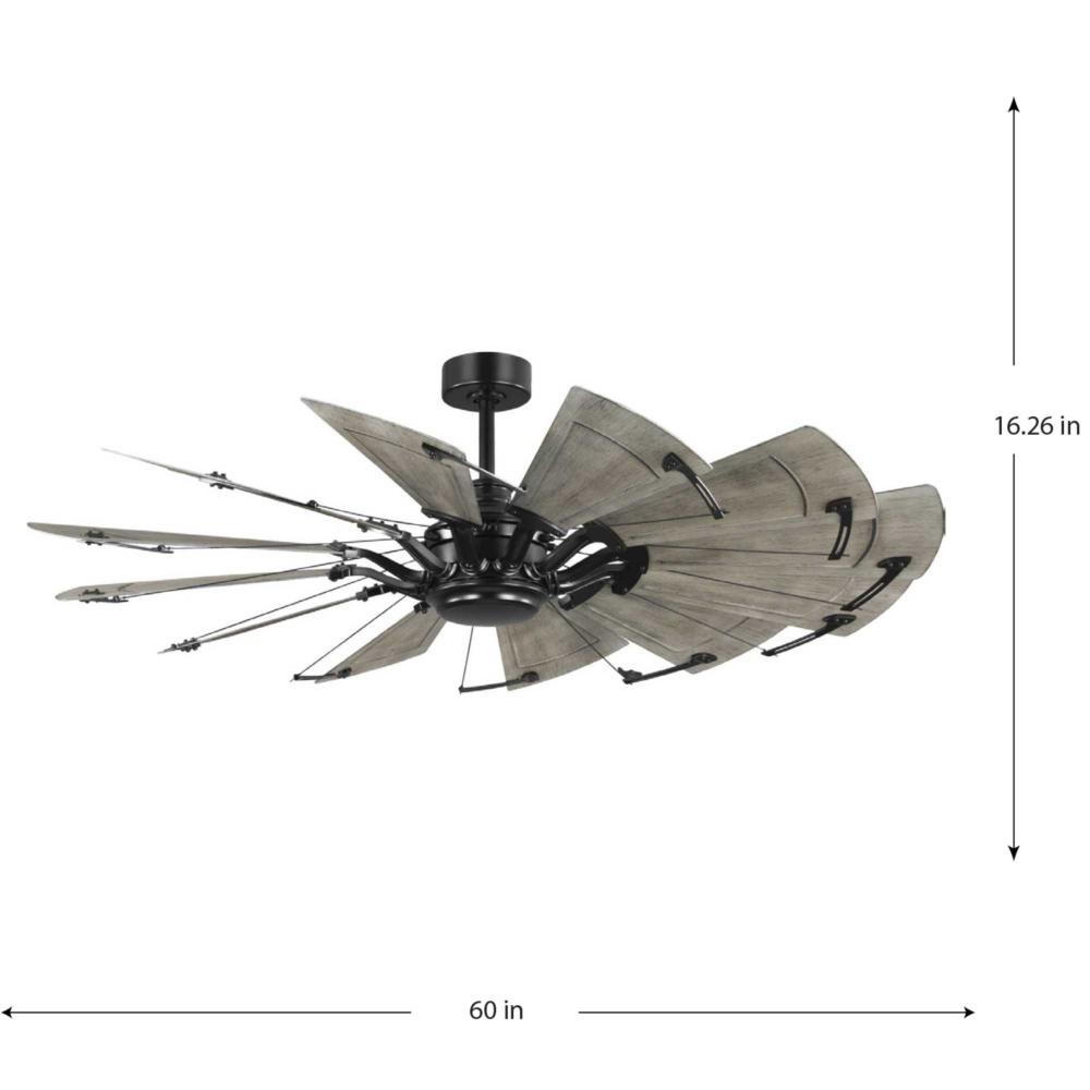 Relax under the refreshing breeze of the Springer Collection 60-Inch Windmill Ceiling Fan. Its large scale and windmill-style blades make it ideal for any great room, bedroom, living room, or bonus room in modern farmhouse, rustic, and coastal-style settings. Its twelve sweeping blades are coated in Distressed Charcoal finish with a Matte Black housing for a rustic flair. Its cULus damp rating makes this lovely fan ideal for use inside or in outdoor covered areas. A 6 speed full-function remote control and wall bracket are included. .