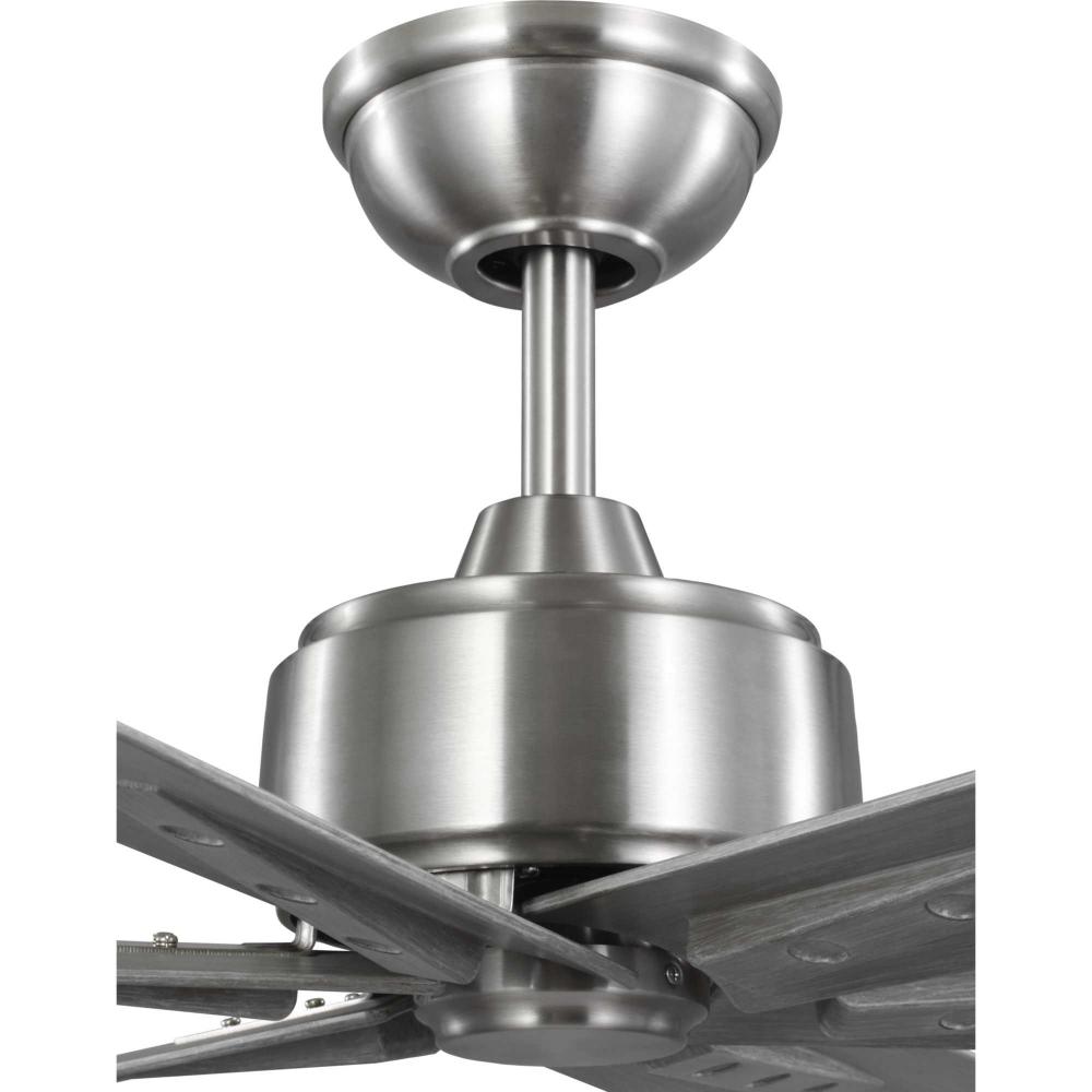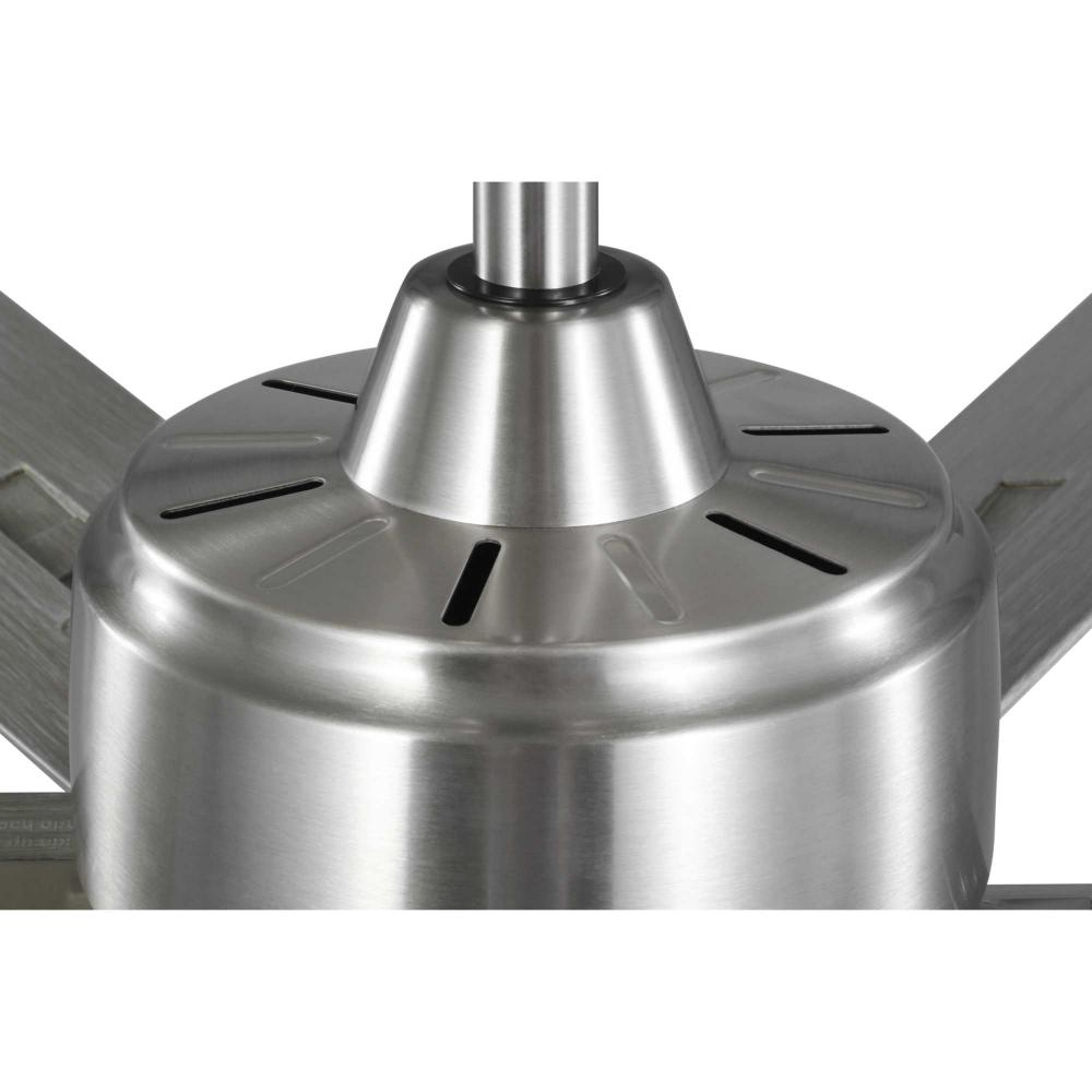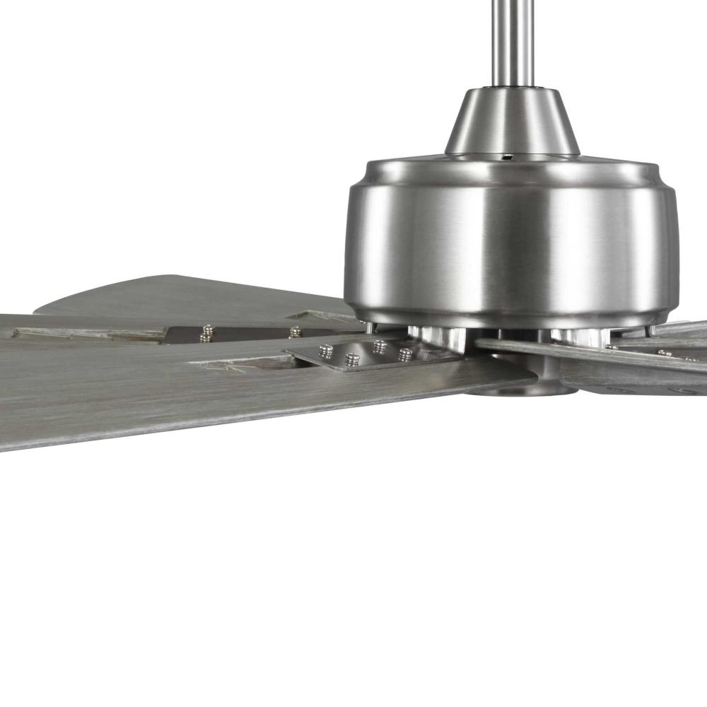 The fan is finished in subtle brushed nickel complemented by six all-weather ABS blades in grey weathered wood finish