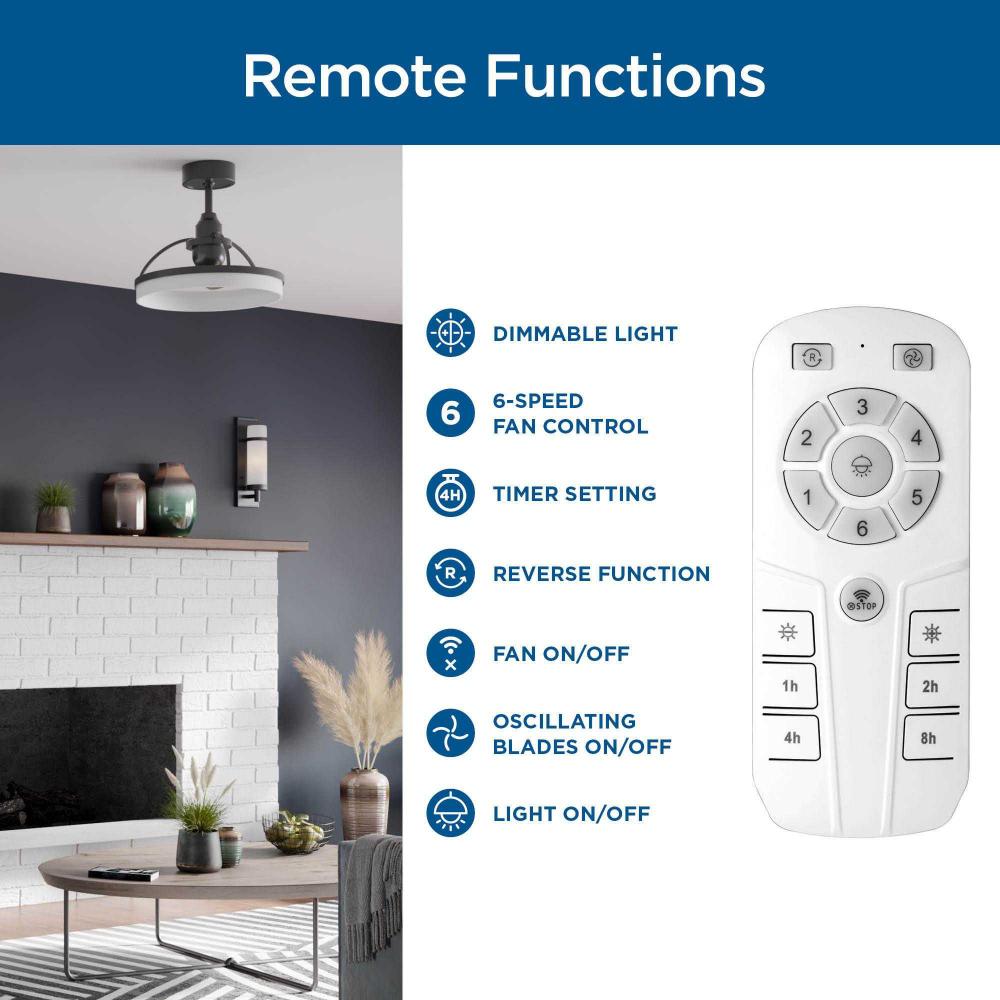 Includes 6 speed handheld remote control with battery and wall bracket.
