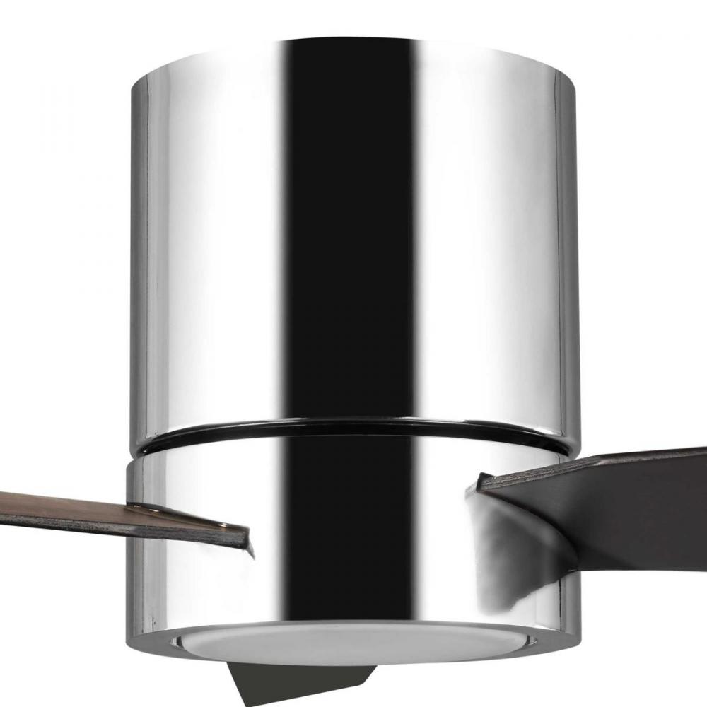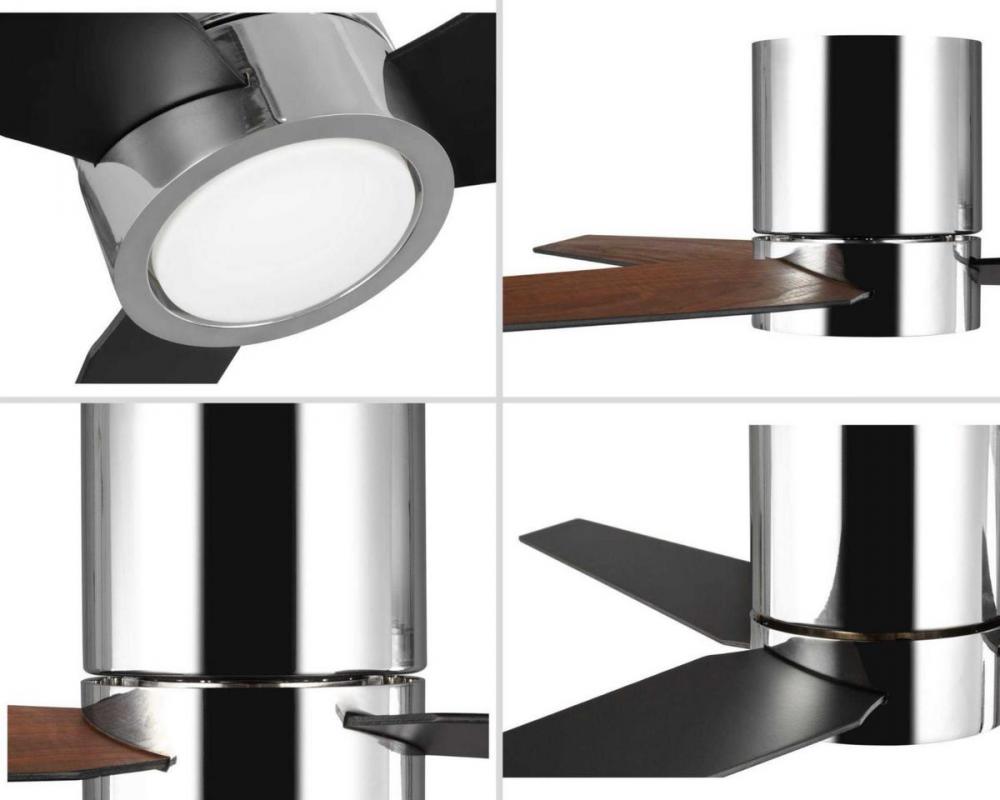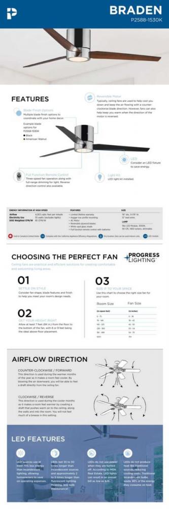 This Braden 56 inch, three-blade, hugger-style ceiling fan features clean lines and a design that complements modern interiors. A shatterproof white opal glass shade contains an integrated 18W LED module, offering both form and function with energy and cost-savings benefits. Featuring a larger motor, Braden moves more air than a traditional hugger ceiling fan. A full function remote with batteries is included. Polished Chrome finish.