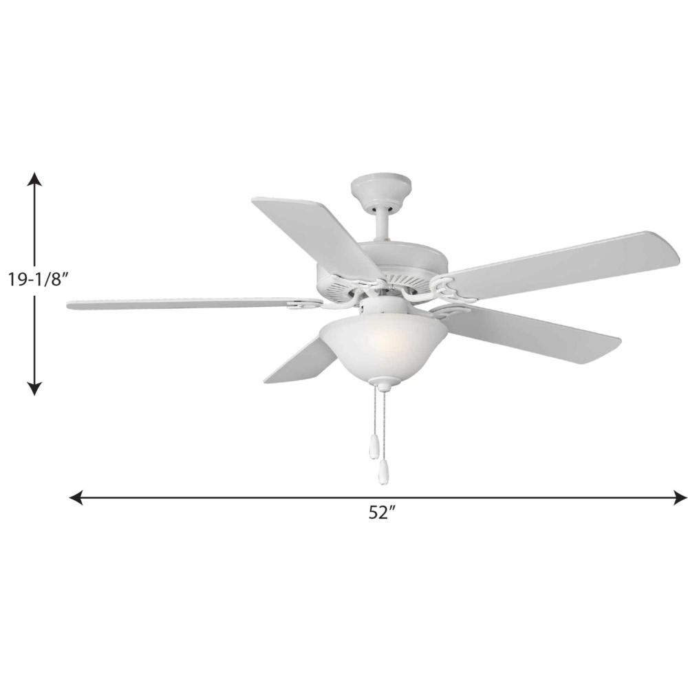 A 52 in two-light, five-blade fan with reversible blades and a beautifully crafted white etched glass bowl. Powerful AirPro motor features 3-speed control that can also be reversed to provide year-round comfort. Two medium-based LED lamps are included (non dimmable), offering energy efficiency and cost savings benefits for the home, while a dual mount canopy accommodates flat or sloped ceilings. White finish.