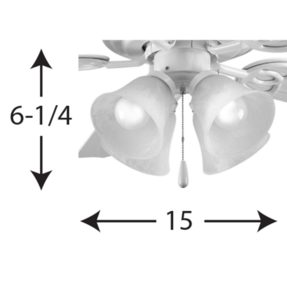 Four-light kit with white washed alabaster style glass shades beautiful in design. Innovative spring clip glass attachment system eliminates unsightly excess hardware. Good for use with P2500 and P2501 ceiling fans and includes quick connector for easy wiring. Includes four 3000K, 800 lumen each (source), Title 24 certified LED bulbs. White Finish.