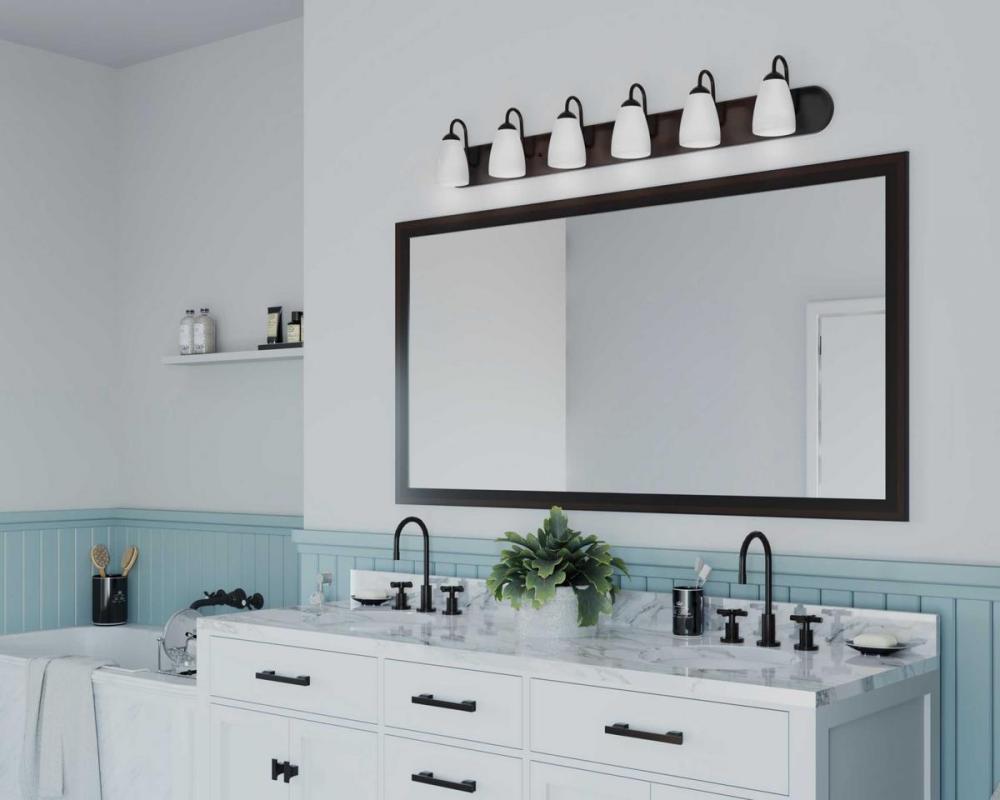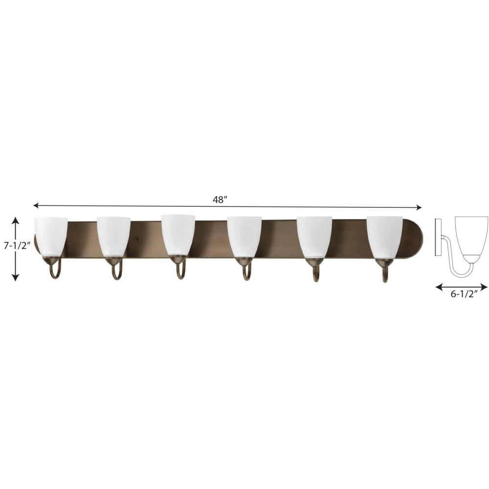 Gather possesses a smart simplicity to complement today's home. This six-light bath bracket contains etched glass shades which add distinction and provide pleasing illumination to your room. Featuring a beautiful Antique Bronze finished frame, this collection allows you to decorate an entire home with confidence and style.