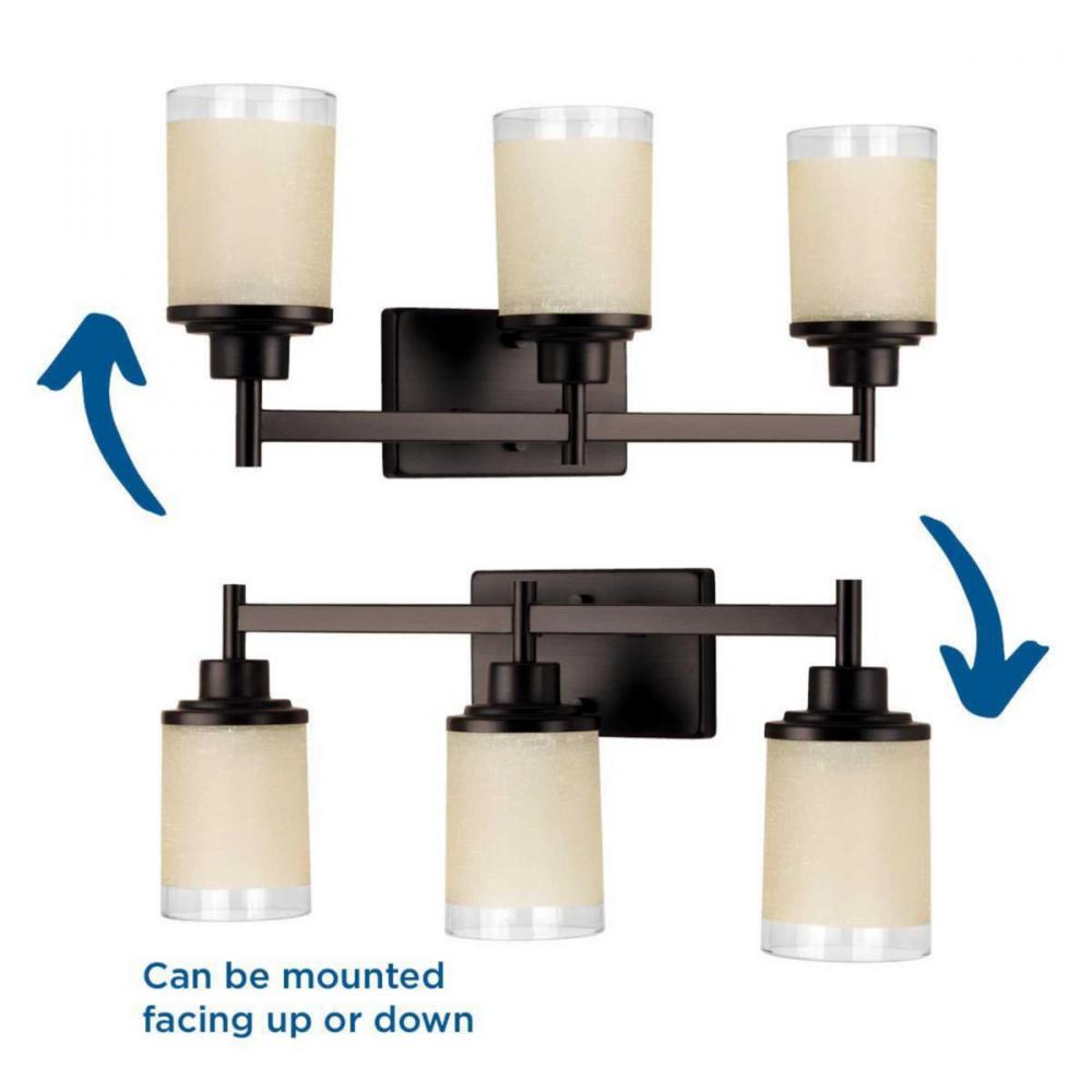 Ideal for a bathroom;Perfect for modern and transitional style settings;Handsome antique bronze finish;Elegant etched umber linen glass shades with clear edge;Mount the light fixture facing up or down;Use 3 medium base bulbs that are sold separately (100 W