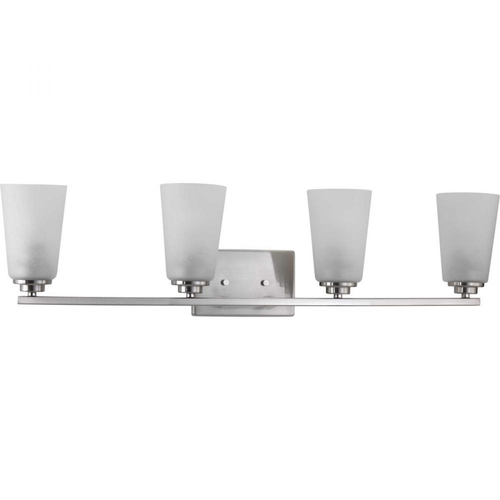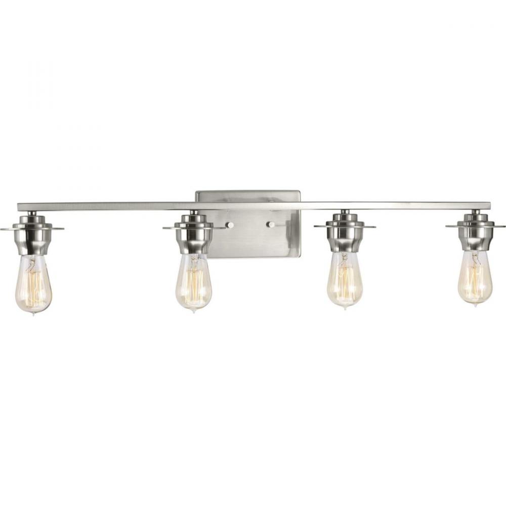 A new category of vintage modern fixtures takes center stage with this four-light bath & vanity fixture from one of our Design Series collections. Delicate details in a Brushed Nickel finish, create statement making focal pieces for a variety of interiors. Debut provides a fitting stage to feature nostalgic, vintage lamps. Glass accessory shades available in clear or frosted seeded finishes.
