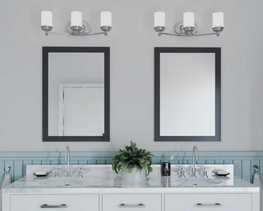 Ideal for a bathroom;Perfect for coastal, farmhouse, and transitional style settings;Beautiful brushed nickel finish;Elegant etched opal glass shades;Mount the light fixture facing up or down;Use 3 medium base bulbs that are sold separately (100 W max - LE