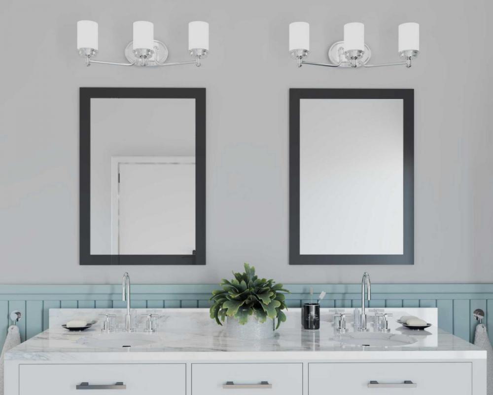 Ideal for a bathroom;Perfect for coastal, farmhouse, and transitional style settings;Crisp polished chrome finish;Elegant etched opal glass shades;Mount the light fixture facing up or down;Use 3 medium base bulbs that are sold separately (100 W max - LED/C
