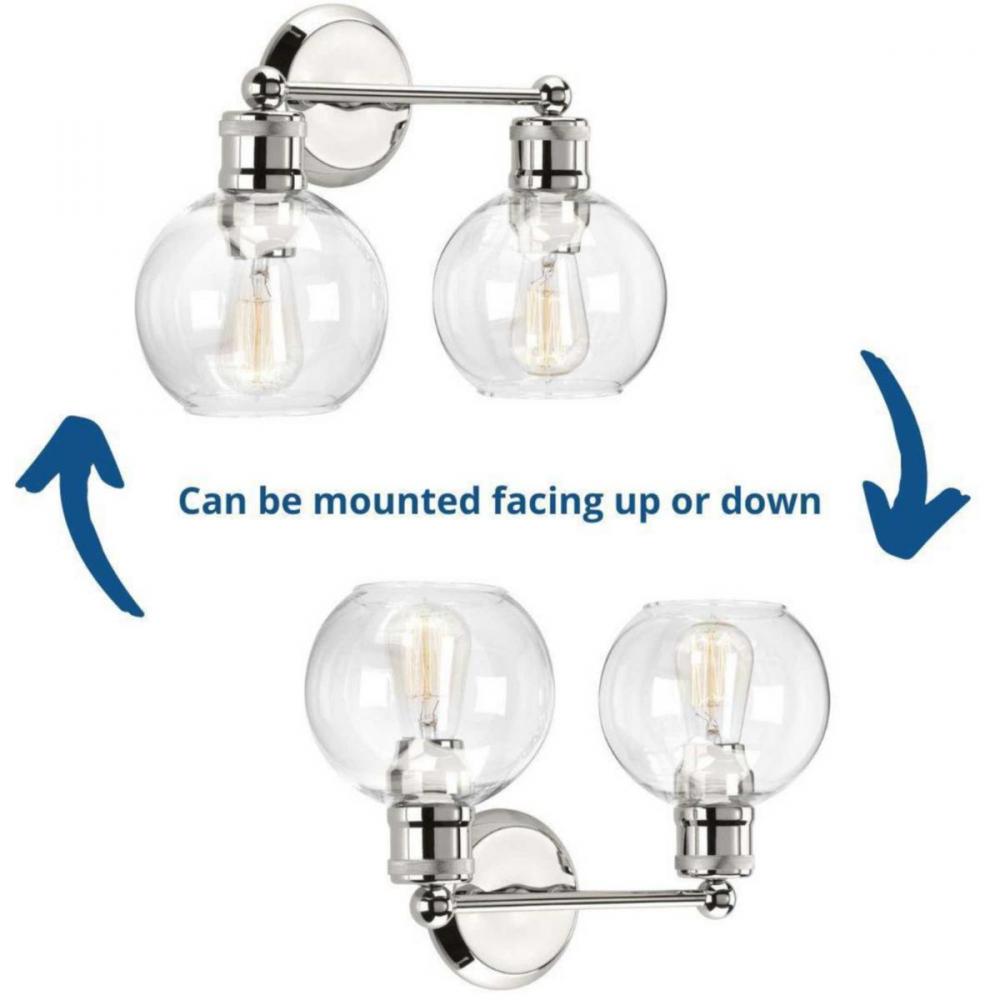 Ideal for a bathroom and powder room.;Perfect for coastal, farmhouse, and vintage electric style settings;Subtle polished nickel finish;Crisp clear glass shades;Mount the light fixture facing up or down;Use 2 medium base bulbs that are sold separately (100