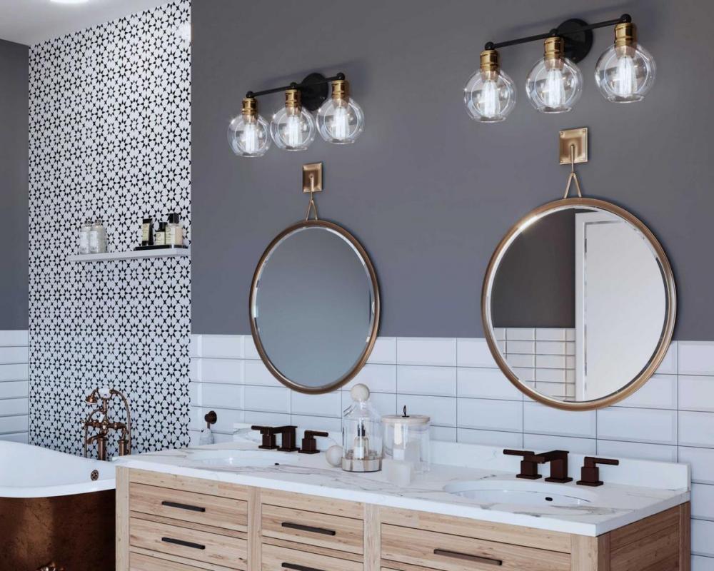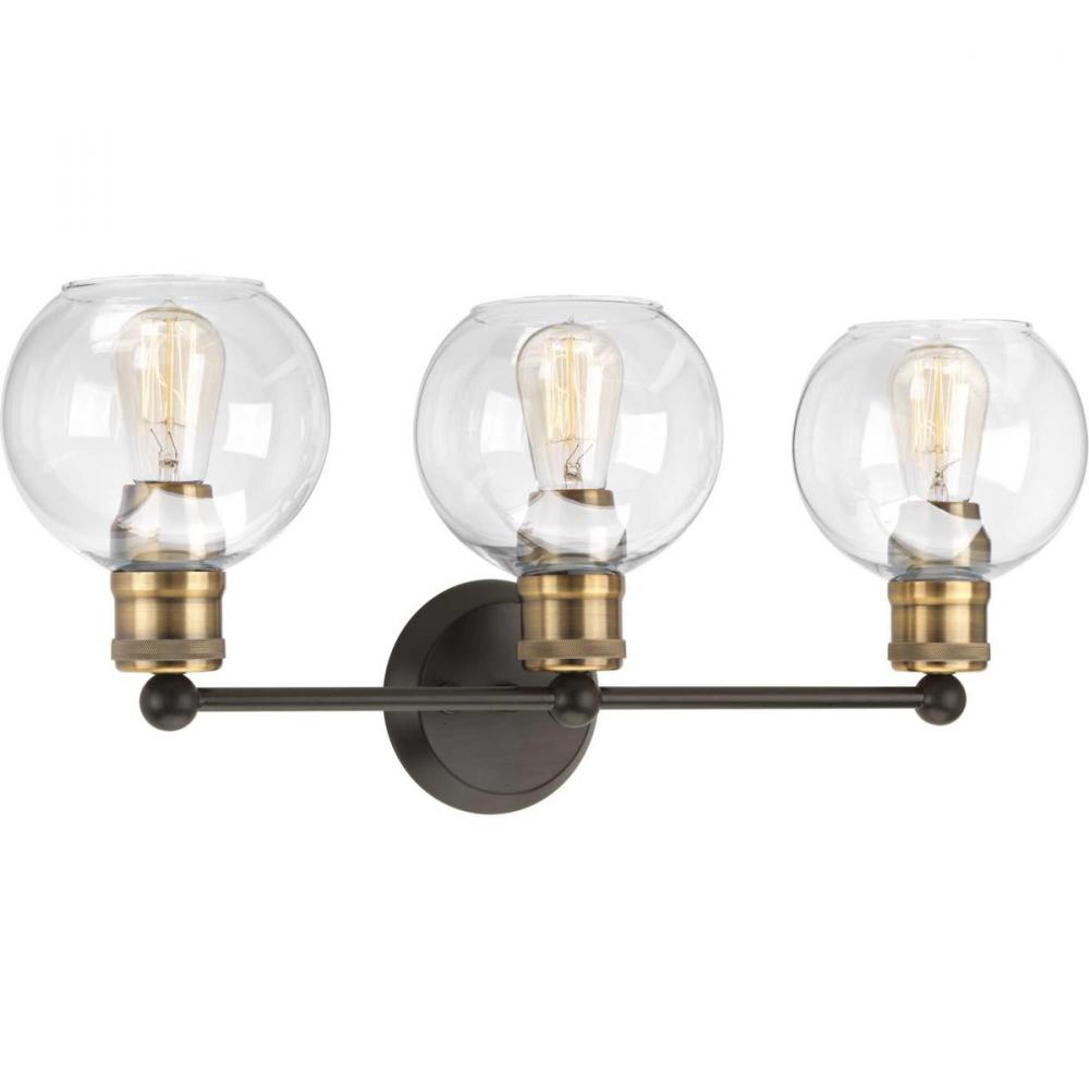 Ideal for a bathroom;Perfect for coastal, farmhouse, and vintage electric style settings;Handsome antique bronze finish with vintage brass accents;Crisp clear glass shades;Mount the light fixture facing up or down;Use 3 medium base bulbs that are sold sepa