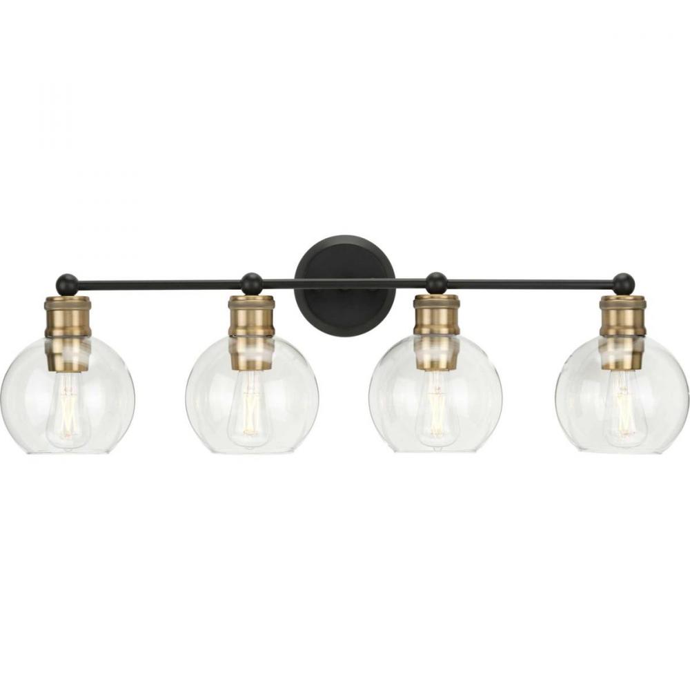 The Hansford collection of fixtures feature a clear, spherical shade paired with vintage style metal fittings in an Antique Bronze and Vintage Brass combination finish. Featuring a clean and precise design with generous scale, Hansford's classic style brings tranquility to your home with. Hansford lends itself to Farmhouse, Coastal or Industrial interiors. Can be used with clear or vintage bulbs for a variety of looks. The four-light bath & vanity fixture can be mounted up or down.