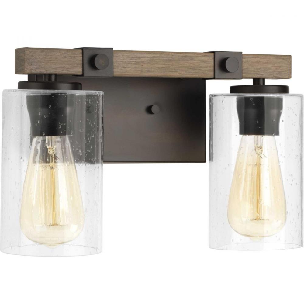 Ideal for a bathroom and powder room.;Perfect for farmhouse, rustic, and urban industrial style settings;Handsome antique bronze finish with faux-painted wooden plank;Rustic clear seeded glass shades;Mount the light fixture facing up or down;Use 2 medium b