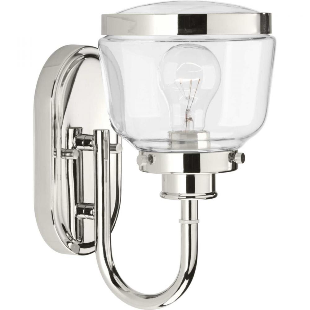 The Judson collection features a timeless clear schoolhouse-style globe. Metal fittings add distinction to complete the vintage look. Judson provides the perfect compliment to farmhouse or coastal-inspired homes. One-light bath & vanity in a Polished Nickel finish.