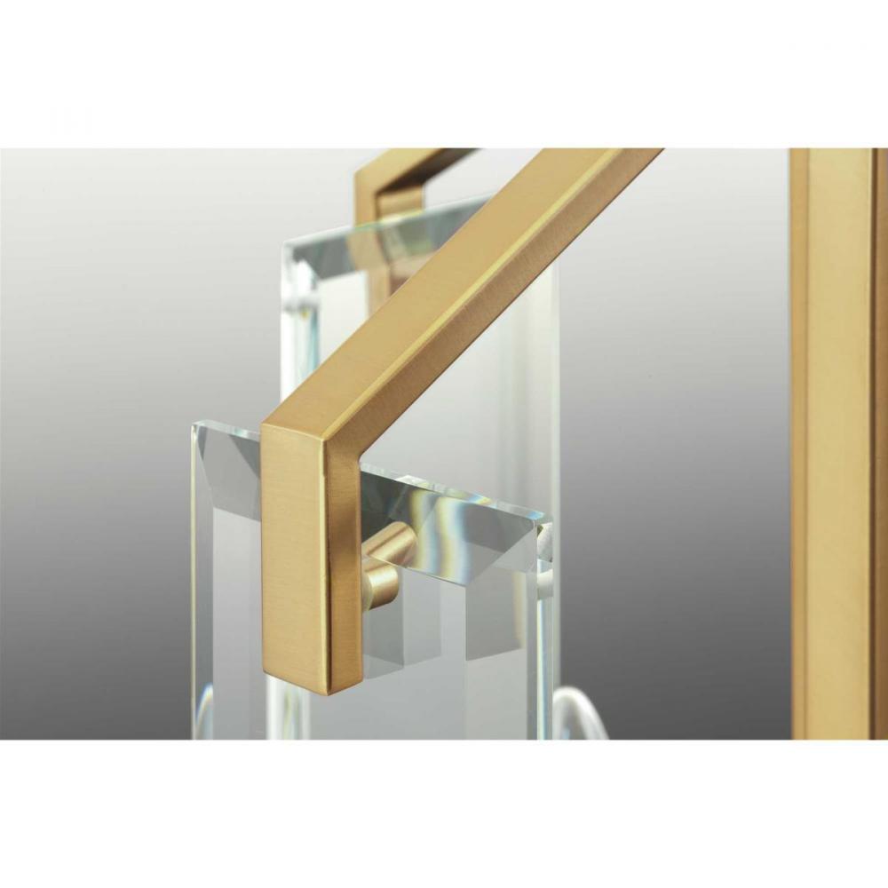 Ideal for a bathroom and powder room.;Perfect for luxe, mid-century modern, and modern style settings;Golden brushed bronze finish;Crisp clear beveled glass shade;Includes installation instructions and mounting hardware;Use 2 candelabra base bulbs that are