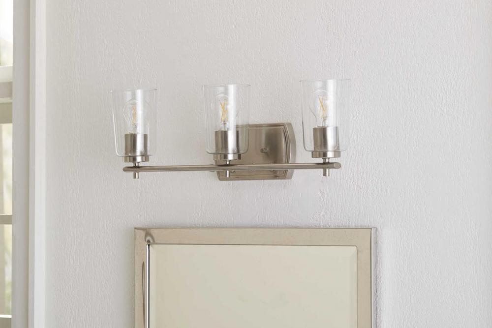 Ideal for a bathroom;Perfect for new traditional, traditional, and transitional style settings;Beautiful brushed nickel finish;Crisp clear glass shades;Mount the light fixture facing up or down;Use 3 medium base bulbs that are sold separately (60 W max - L