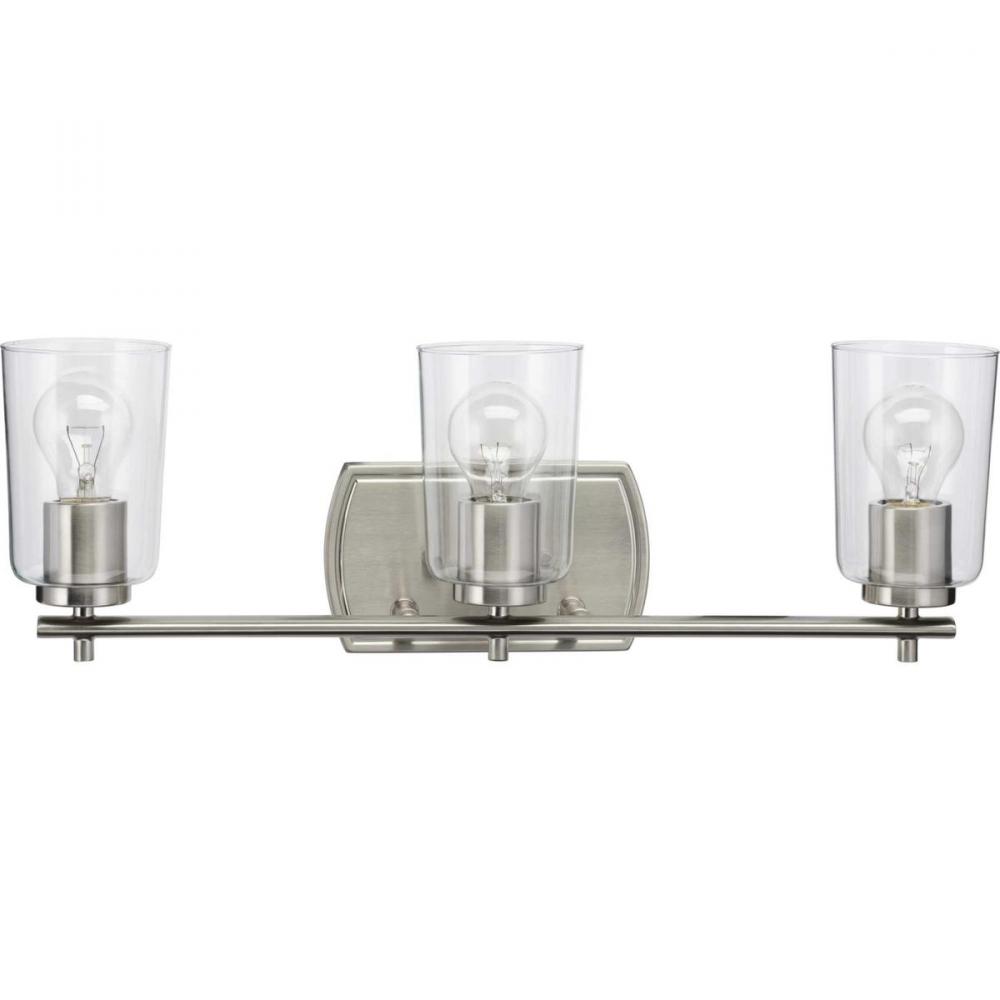Reconnect with a long-lost inner peace and vitality with the soft glow of the Adley three-light bath. A trinity of modern, clear glass shades attach to a curved, Brushed Nickel backplate. The piece will find a home in any bathroom or vanity setting in traditional and transitional interiors.