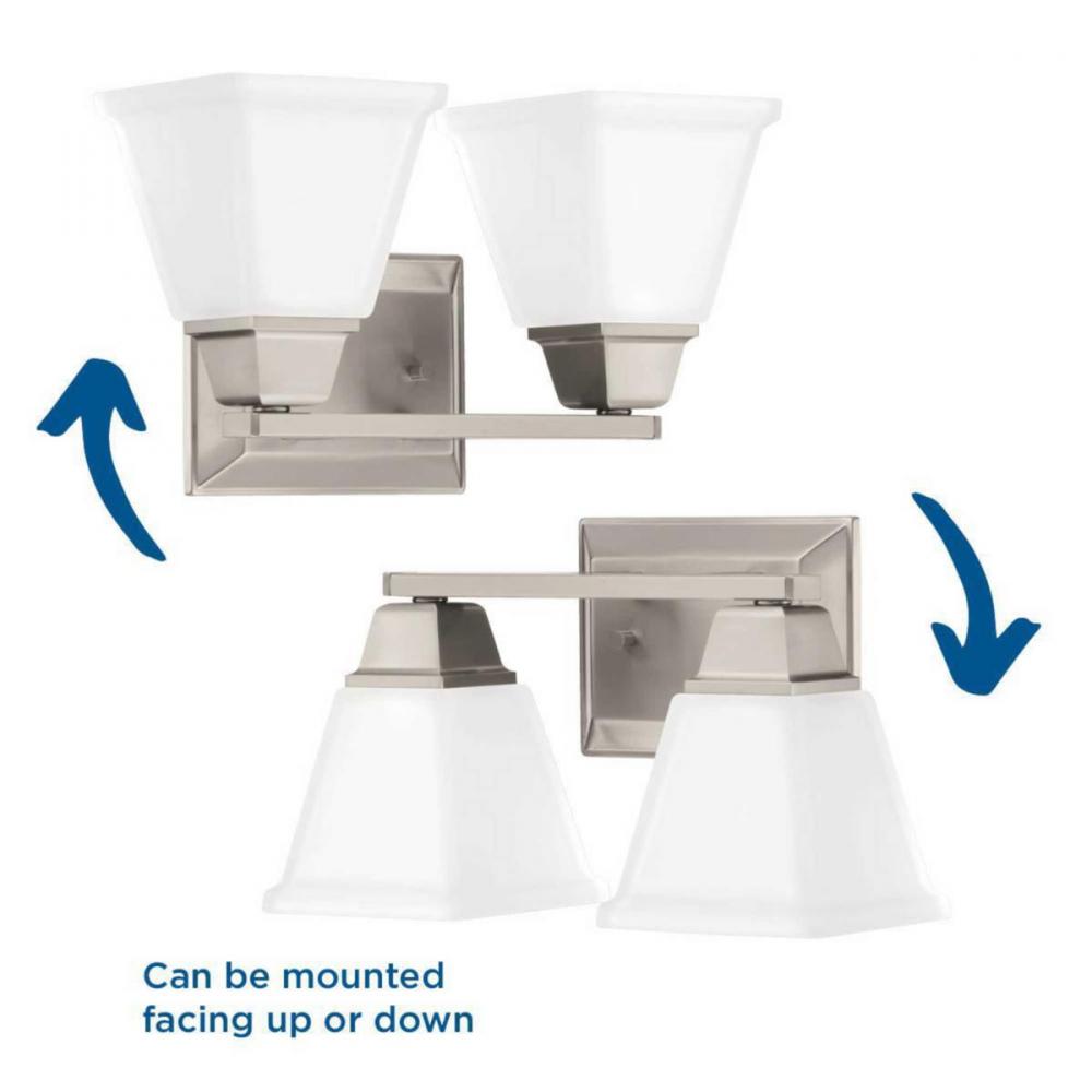 Ideal for a bathroom and powder room.;Perfect for craftsman, farmhouse, modern, and modern craftsman style settings;Beautiful brushed nickel finish;Elegant etched glass shades;Mount the light fixture facing up or down;Use 2 medium base bulbs that are sold