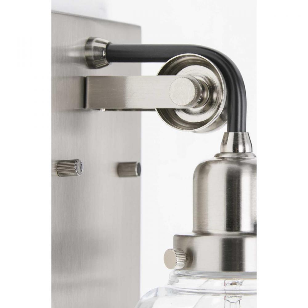 Decorate and add functional lighting to either side of a mirror or throughout the home with the timeless Rushton one-light bath. A single exposed bulb surrounded by a clear glass shade hangs from an antique-style socket. The faux cord extending from the Brushed Nickel backplate wraps around the miniature pulley wheel to create a one-of-a-kind arm to hold the fixture in place. With its tasteful industrial design, this piece is ideal as a bath vanity or wall sconce in industrial and farmhouse settings.