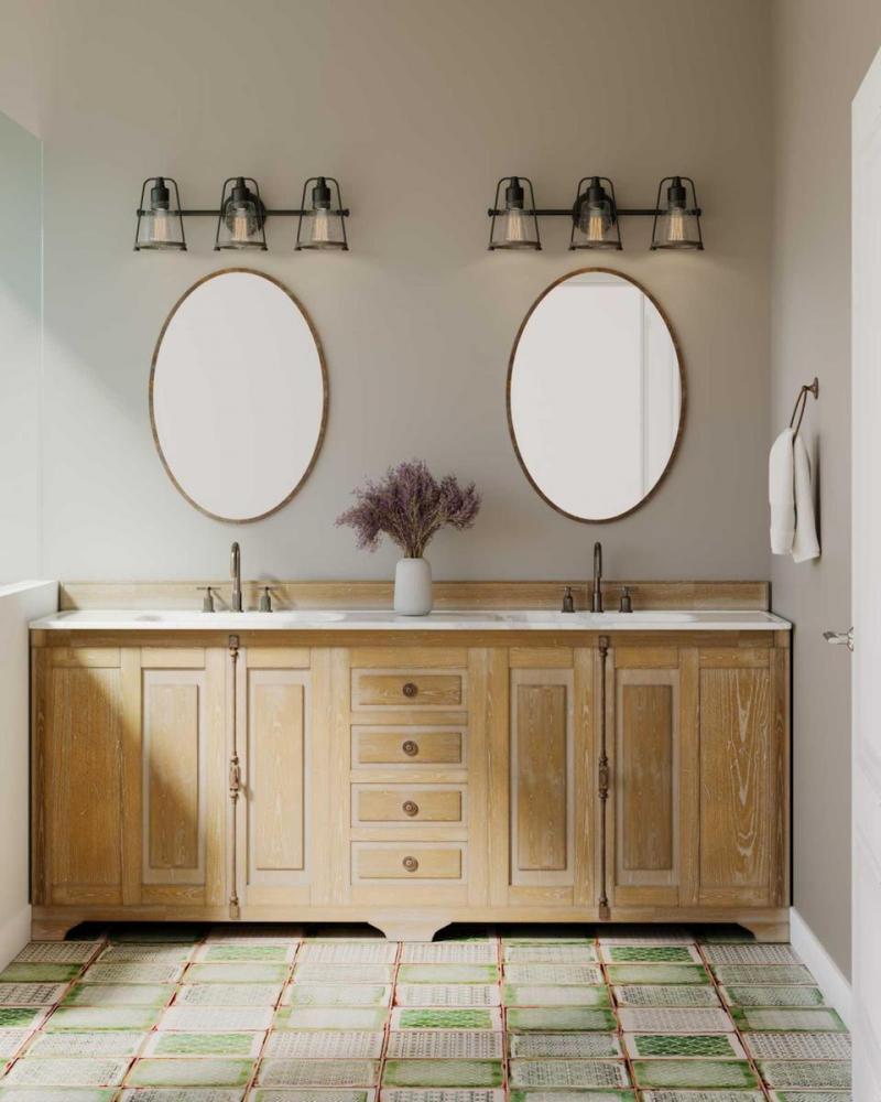 Mix old and new for charming character with the Conway Collection 3-Light Matte Black Clear Seeded Farmhouse Bath Vanity Light. A matte black bell-shaped frame and round backplate are accented by hand-painted, weathered grey wood-style accents for a charming nautical aesthetic. A light source glows from within a clear seeded glass shade for visual texture.