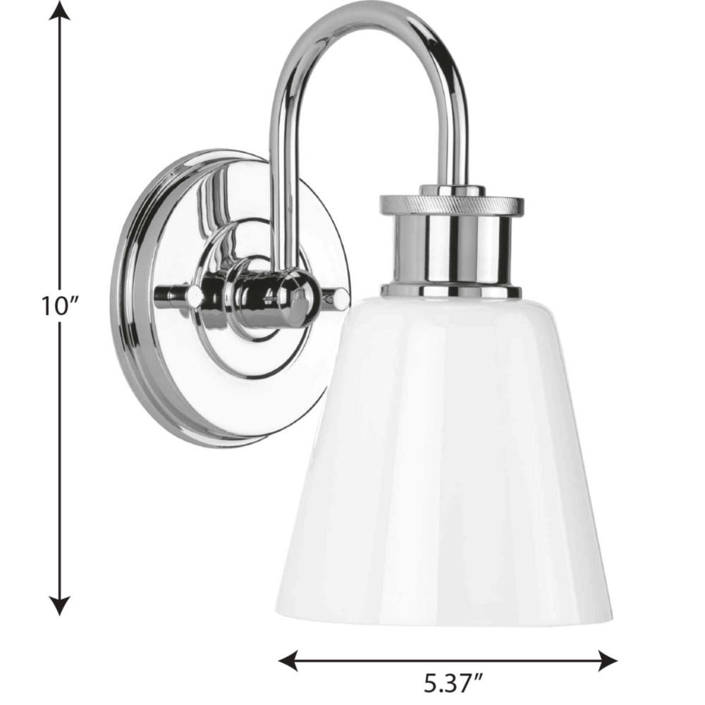 Provide nostalgic charm with the Ashford Collection 1-Light Polished Chrome Opal Glass Farmhouse Bath Vanity Light. The circular backplate, elegantly curved arm, and vintage light bases are coated in a beautiful polished chrome finish for a crisp aesthetic. A light source glows from inside an opal glass shade that skillfully blends the old with the new.