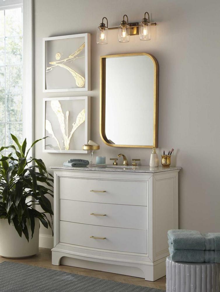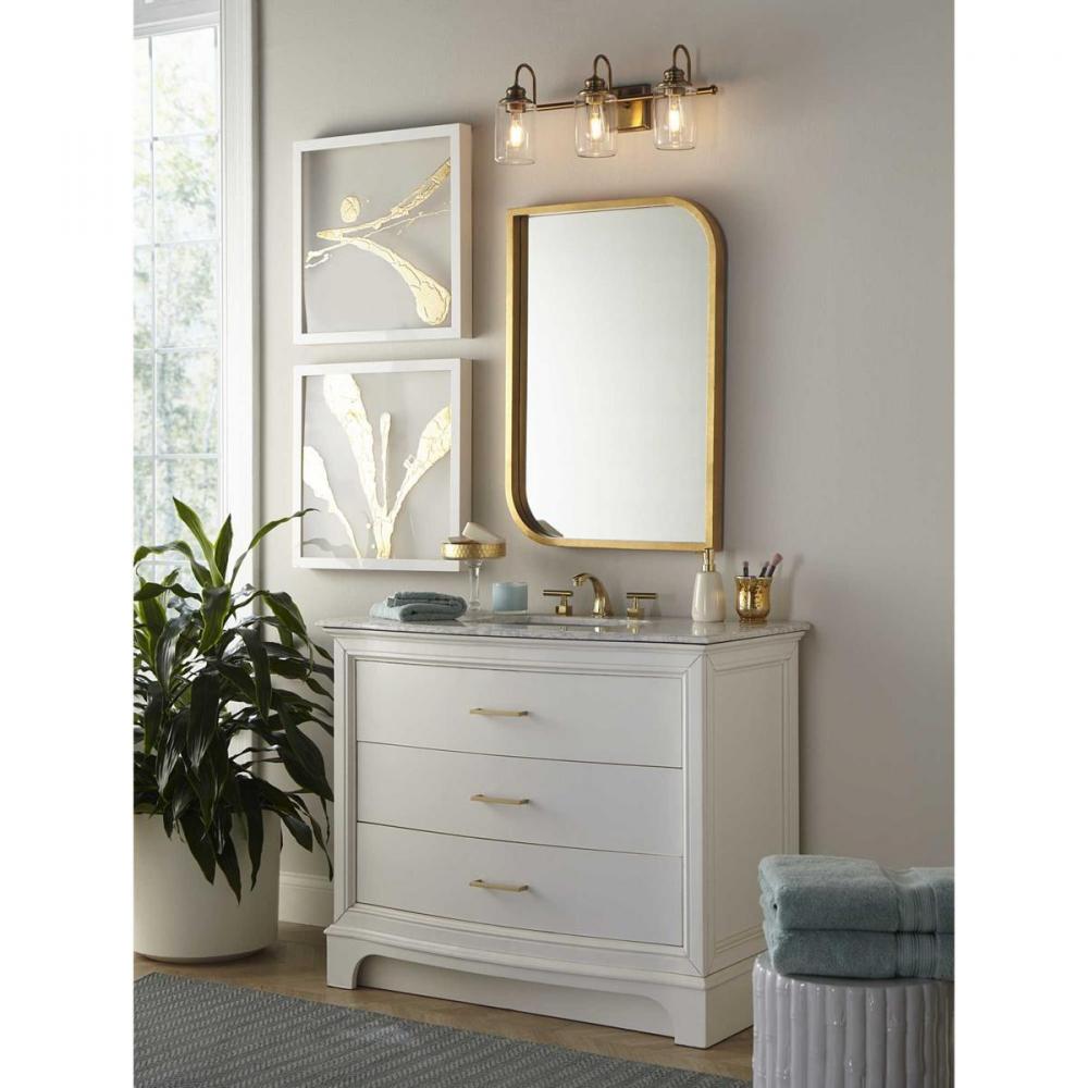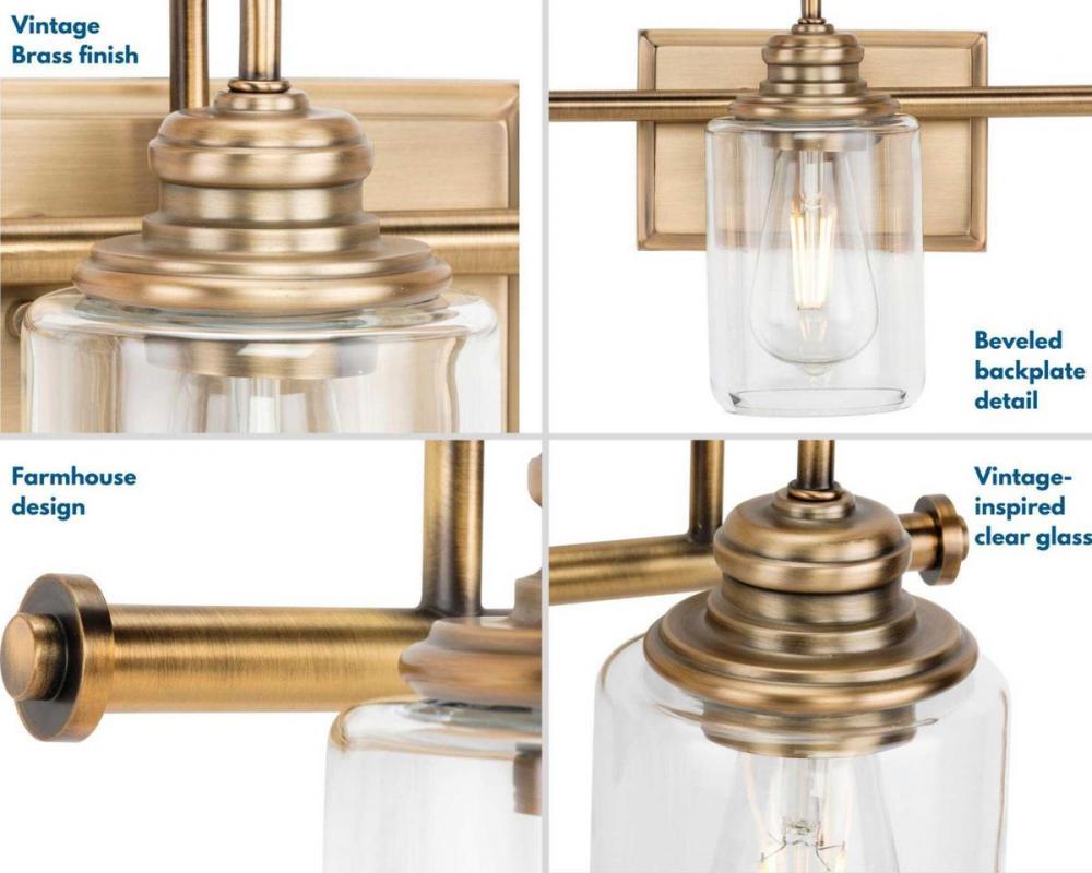 Application: Ideal for any bathroom.;Style: Perfect for farmhouse and transitional style settings.;Finish: The beveled backplate, curved arms, and decorative vintage light bases are coated in a beautiful vintage brass finish that will transform any bath fr