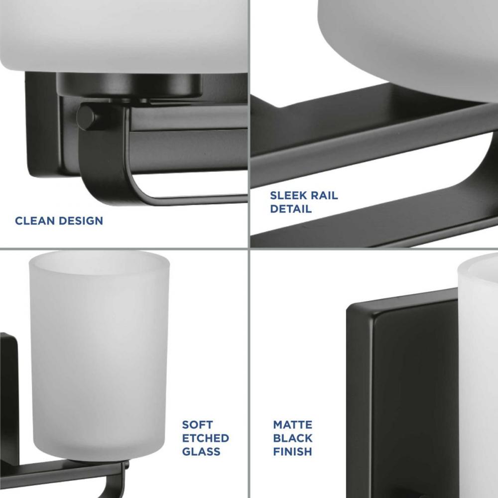 Distinguish your home with clean modern design with the League Collection Four-Light Matte Black and Etched Glass Modern Farmhouse Bath Vanity Light ideal for any bathroom. The crisp backplate and sleek steel rail are coated in a beautiful brushed nickel to create a modern aesthetic. Classic etched glass shades emphasize the contrast between soft and clean.