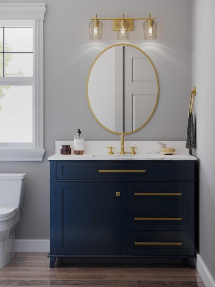 Ideal for a bathroom;Perfect for new traditional style settings;Golden vintage brass finish;Crisp clear glass shades;Use 3 medium base bulbs that are sold separately (60w max - LED/CFL/incandescent), compatible with dimmable bulbs;Measures 8-1/2-inch heigh