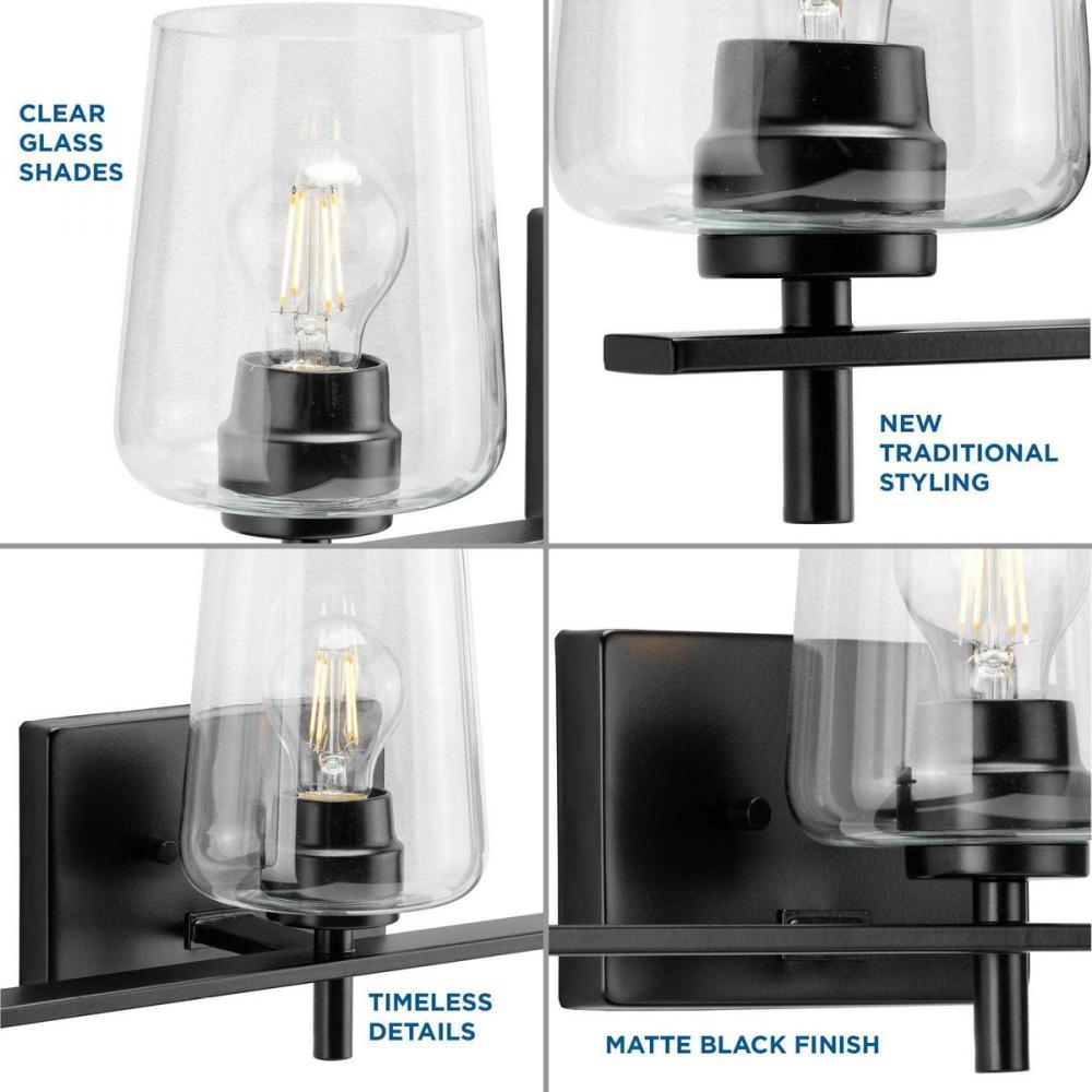 Create an enduring silhouette ornamented by timeless details with a bath vanity light from the Calais Collection. The elegantly simple frame is coated in a classic matte black finish. Clear glass shades provide a contemporary take on the traditional design. Compatible with dimmable bulbs.