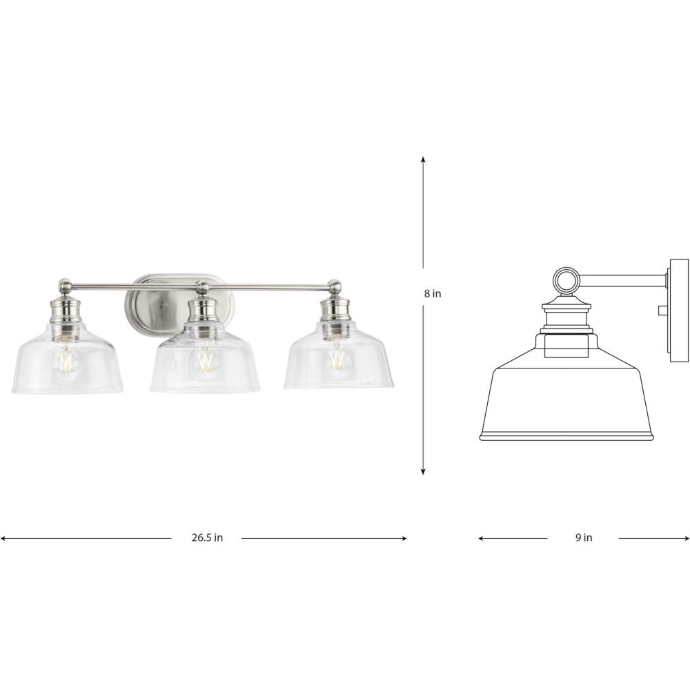 The Singleton Collection 3-light vanity fixture pays homage to industrial styling with oversized warehouse shades fabricated from clear glass. A round backplate and vintage-inspired metal fittings finished in subtle brushed nickel create a timeless design. Place above the vanity mirror for optimal task lighting in the bath. This versatile vanity light can be mounted up or down, casting even illumination in any setting.