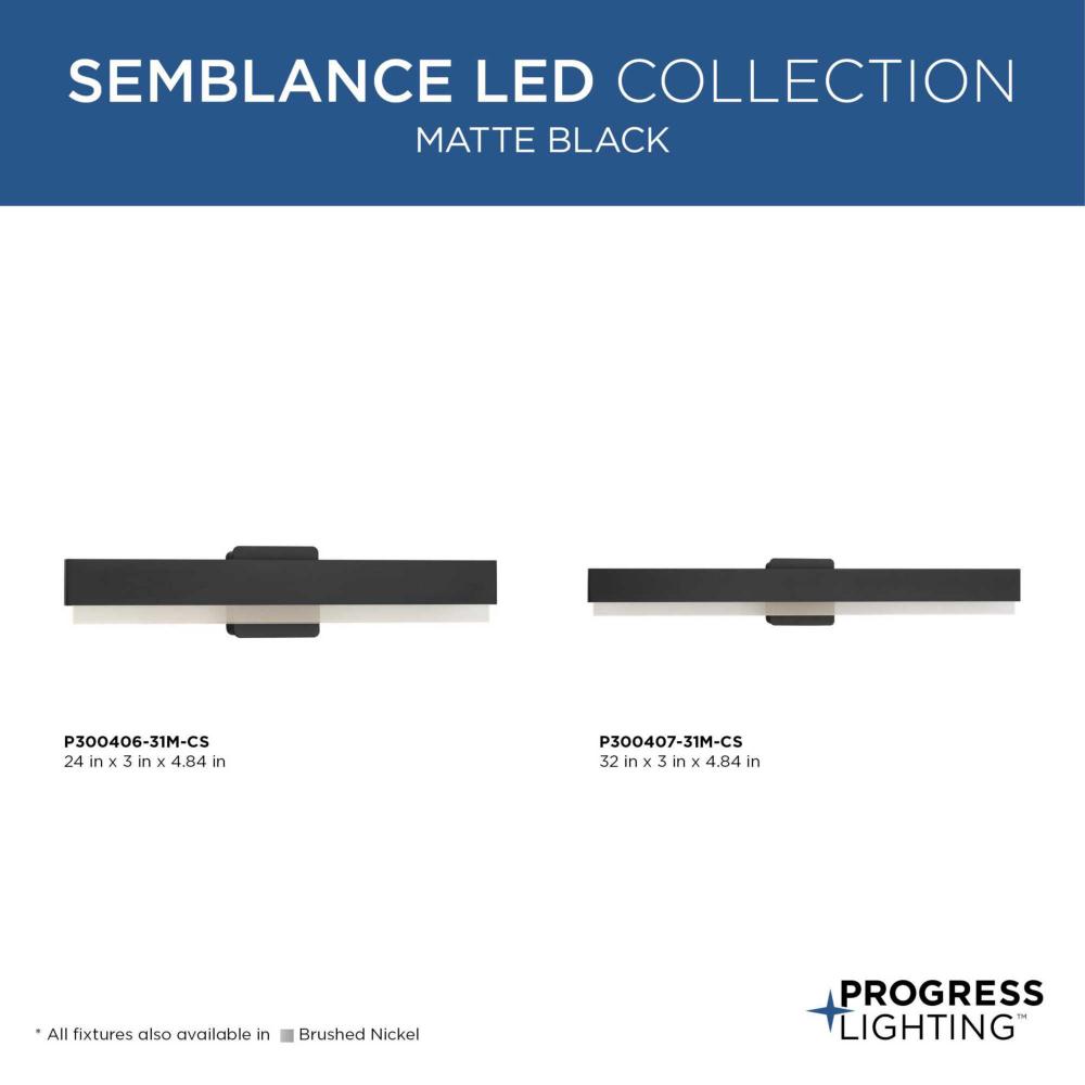 Add contemporary style to bathrooms with the Semblance Collection LED Medium Linear Vanity light. This versatile design is ideal for any bathroom in contemporary or modern commercial or residential settings. Progress Lighting products are designed for exceptional quality, reliability, and functionality. Anchored by a sleek, square backplate, a handsome rectilinear metal bar holds an acrylic diffuser along its length, creating edge-lit illumination. Finished in crisp matte black. Color selectable technology offers a choice of 3000K, 4000K or 5000K at a flip of a switch to perfectly illuminate surroundings with multi-directional, energy-efficient light. This versatile design is ideal for any bathroom in contemporary or modern commercial or residential settings. Progress Lighting products are designed for exceptional quality, reliability, and functionality.