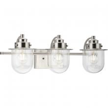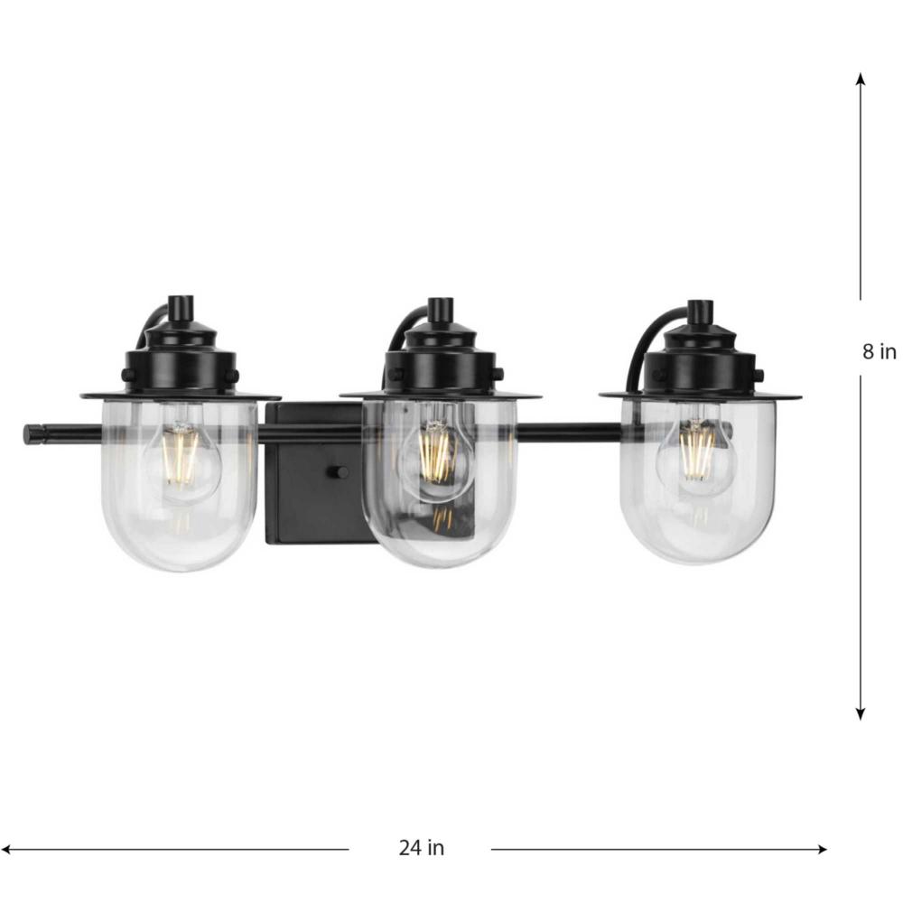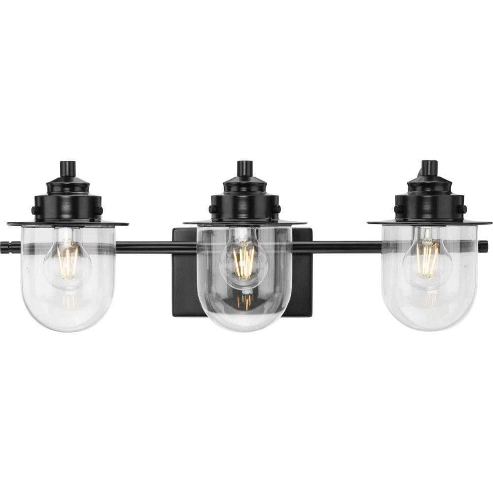 The nostalgic Northlake Collection combines classic design influences with nautical inspiration. Finished in matte black, the rounded diffuser and layered caps are reminiscent of floating buoys and weekends on a mountain lake. Clear glass shades cast a pleasing glow in bathrooms and powder rooms in coastal and transitional settings. This versatile fixture can be mounted up or down, increasing its design flexibility. It is cULus damp rated and has a one-year warranty to guarantee your complete satisfaction. Progress Lighting products offer exceptional quality, reliability, and functionality. .