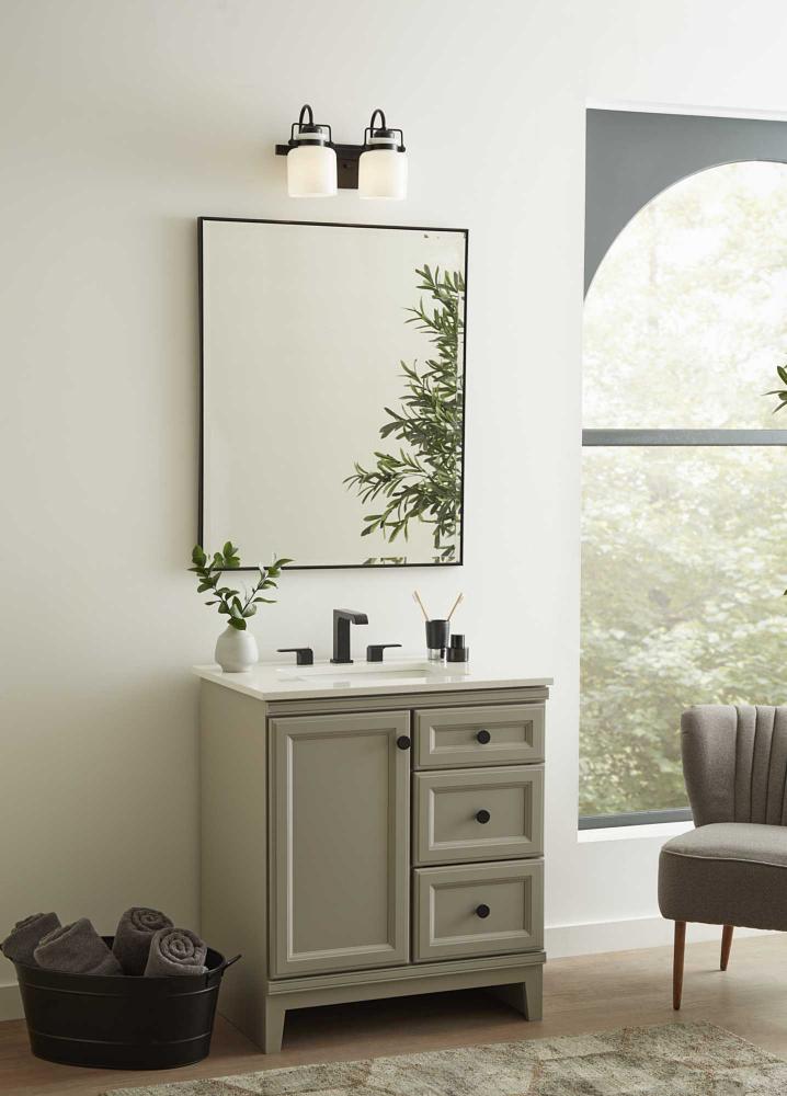 Distinctive mechanical details establish a nostalgic flair in the elegant Fessler collection. Opal glass shades deliver comfortable diffuse illumination to bathrooms and powder rooms in transitional and farmhouse settings. The decorative frame is coated in a crisp matte black and features authentically crafted hardware elements that complements the curved opal shades. This versatile fixture can be mounted up or down, increasing its design flexibility. It is cULus damp location listed, with a one-year warranty to guarantee your complete satisfaction. Progress Lighting products are designed for exceptional quality, reliability, and functionality. .