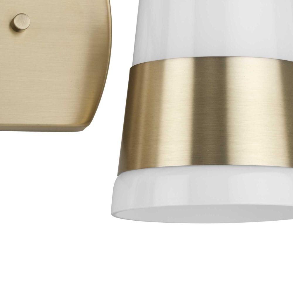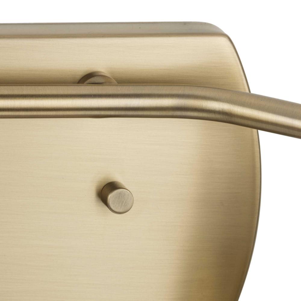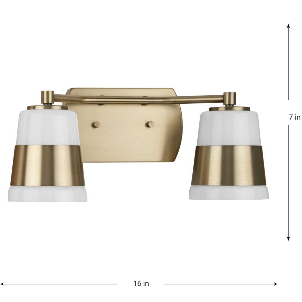 The Haven Collection is practical and stylish with a modern color blocking silhouette that fits perfectly in luxe industrial and contemporary rooms. The metal frame is finished in elegant vintage brass and features shades suspended from an oblong backplate. Etched opal glass casts a pleasing, softened glow in bathrooms and powder rooms. This versatile fixture can be mounted up or down, increasing its design flexibility. It is cULus damp location listed, with a one-year warranty to guarantee your complete satisfaction. Progress Lighting products offer exceptional quality, reliability, and functionality.