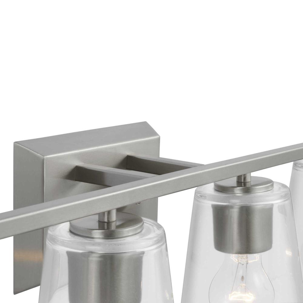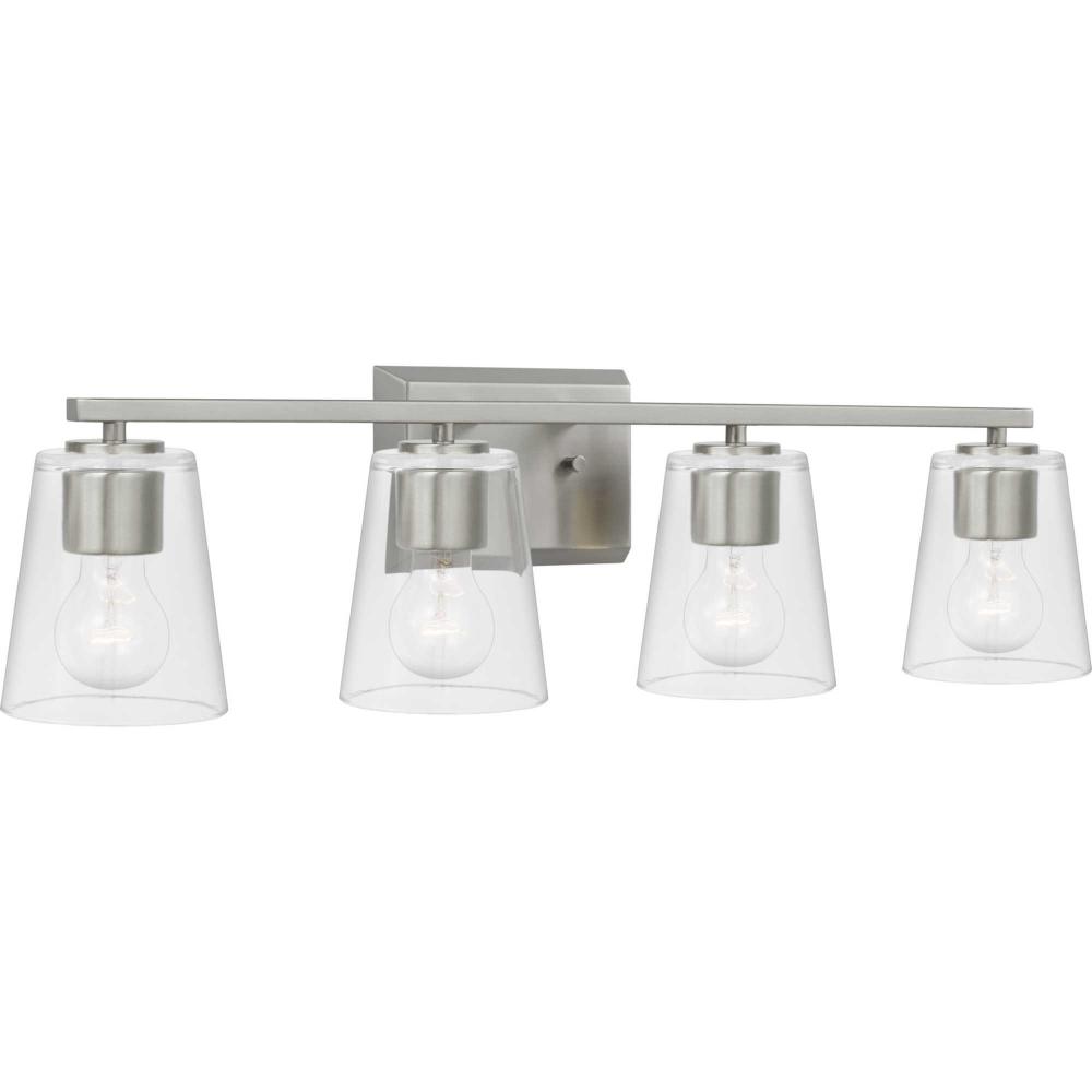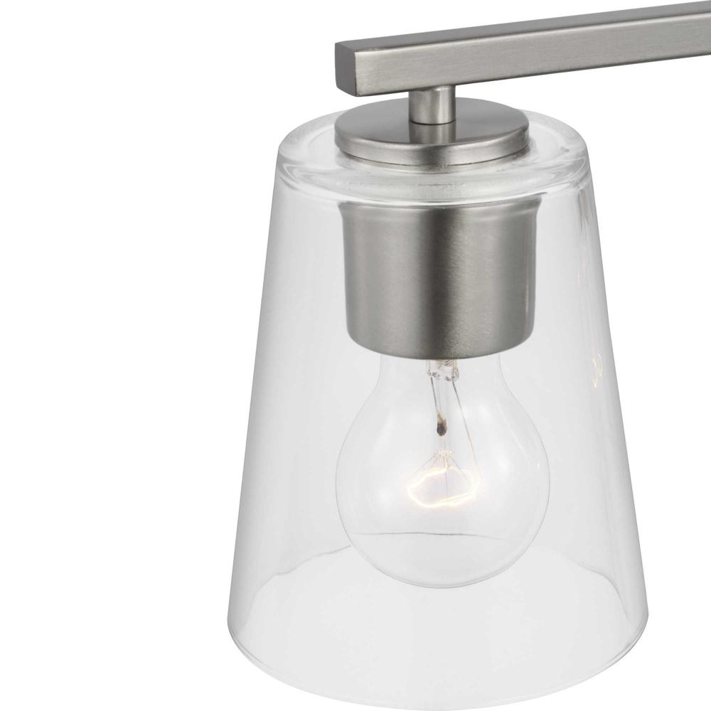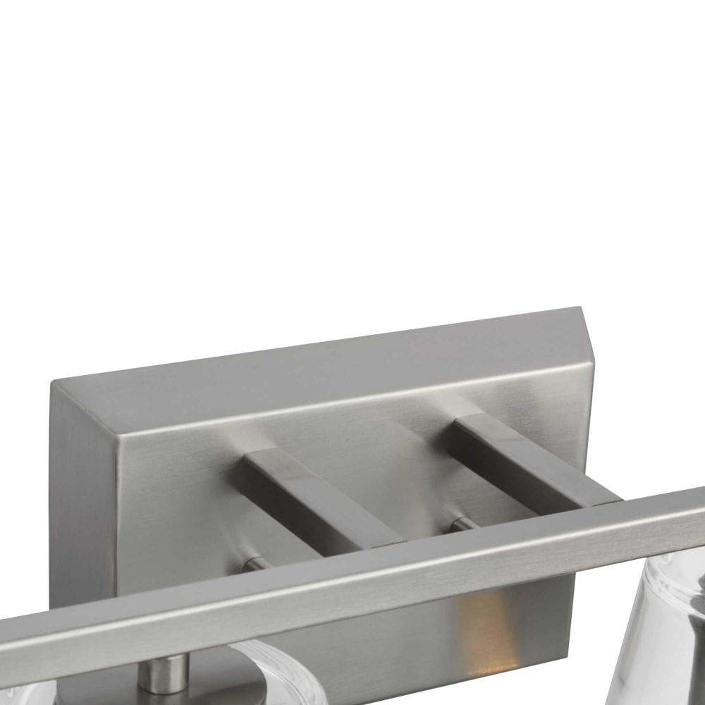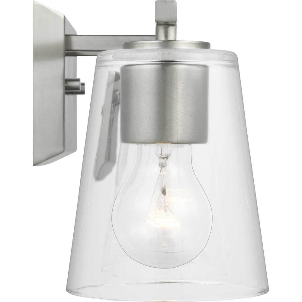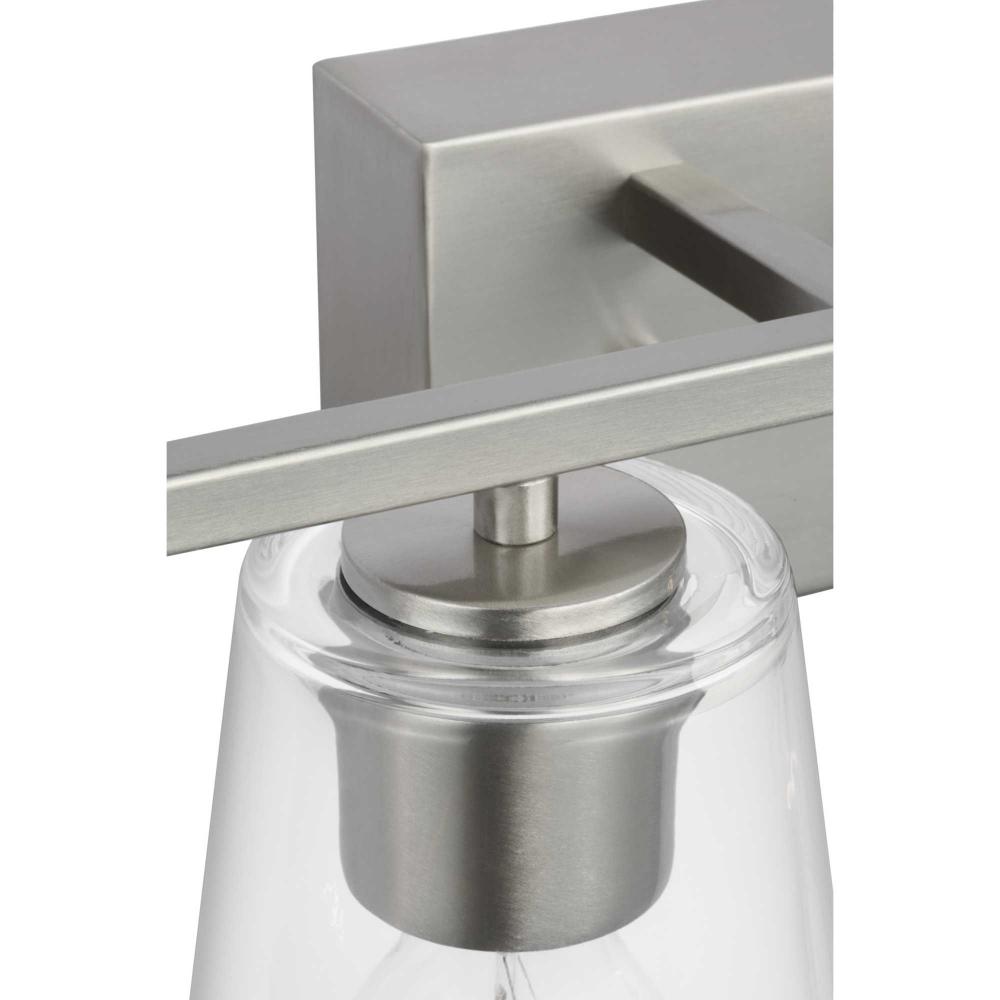 Elegantly extended, the Vertex Collection is composed of angular forms finished in subtle brushed nickel to create a bold design that perfectly complements modern interiors. Glass shades delivers bright illumination to bathrooms and powder rooms in contemporary settings. This versatile fixture can be mounted up or down, increasing its design flexibility. It is cULus damp rated and has a one-year warranty to guarantee your complete satisfaction. Progress Lighting products offer exceptional quality, reliability, and functionality. .