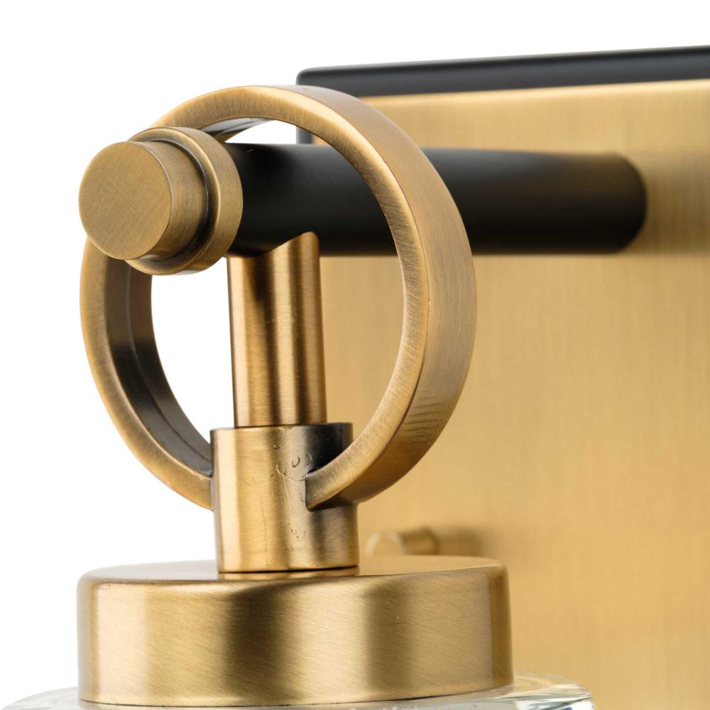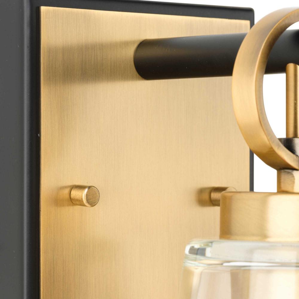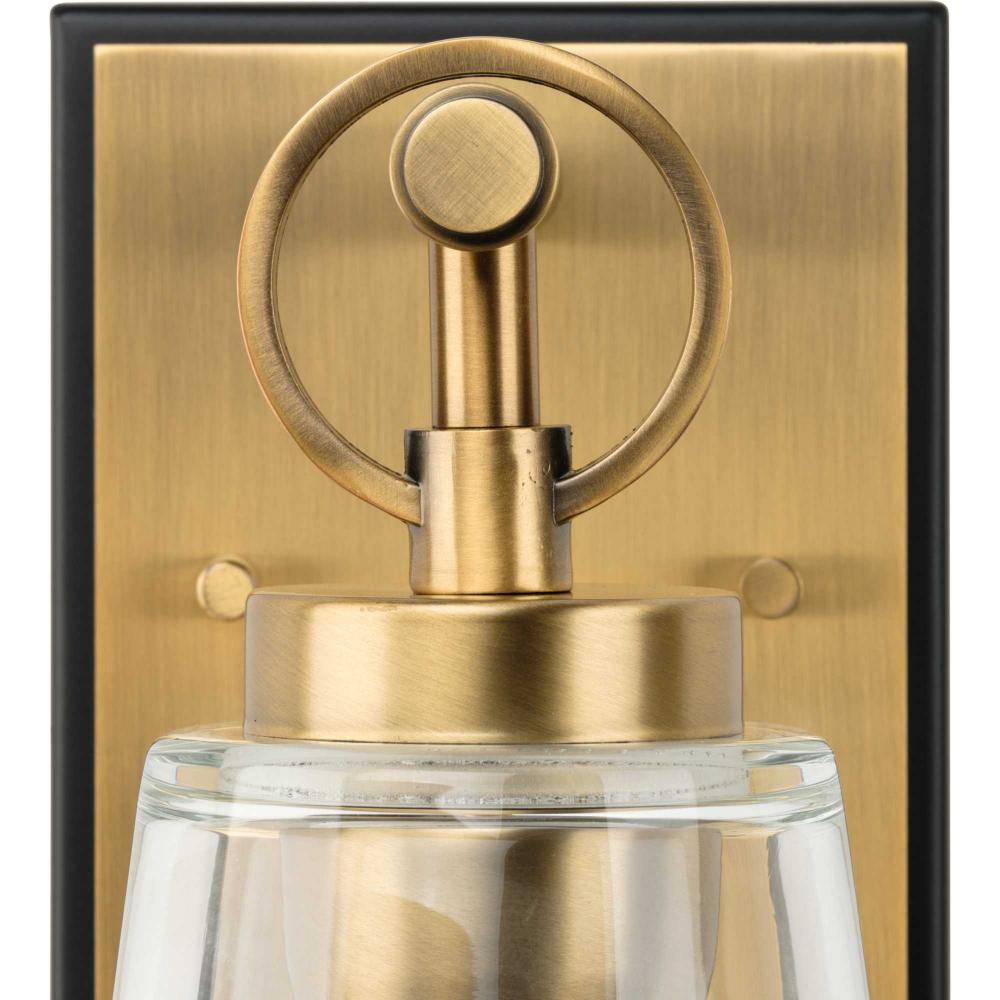 The Cassell One-Light Vanity Fixture brings an enduring style to the bath. The light boasts a dual-tone finish of Vintage Brass and Matte Black that accentuates its distinguished and handsome design. Tailored details smoothly blend linear precision with an elegant circular ring and clear glass shade.