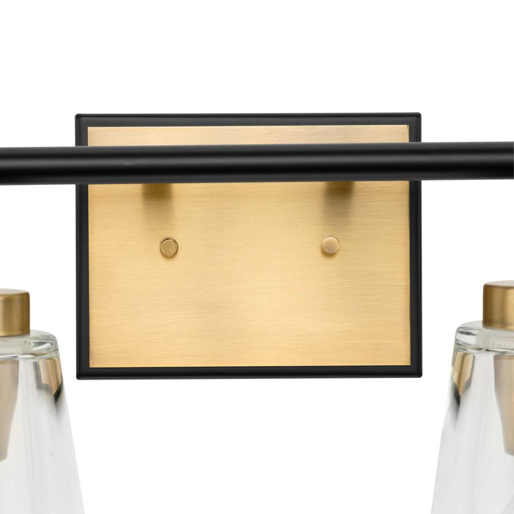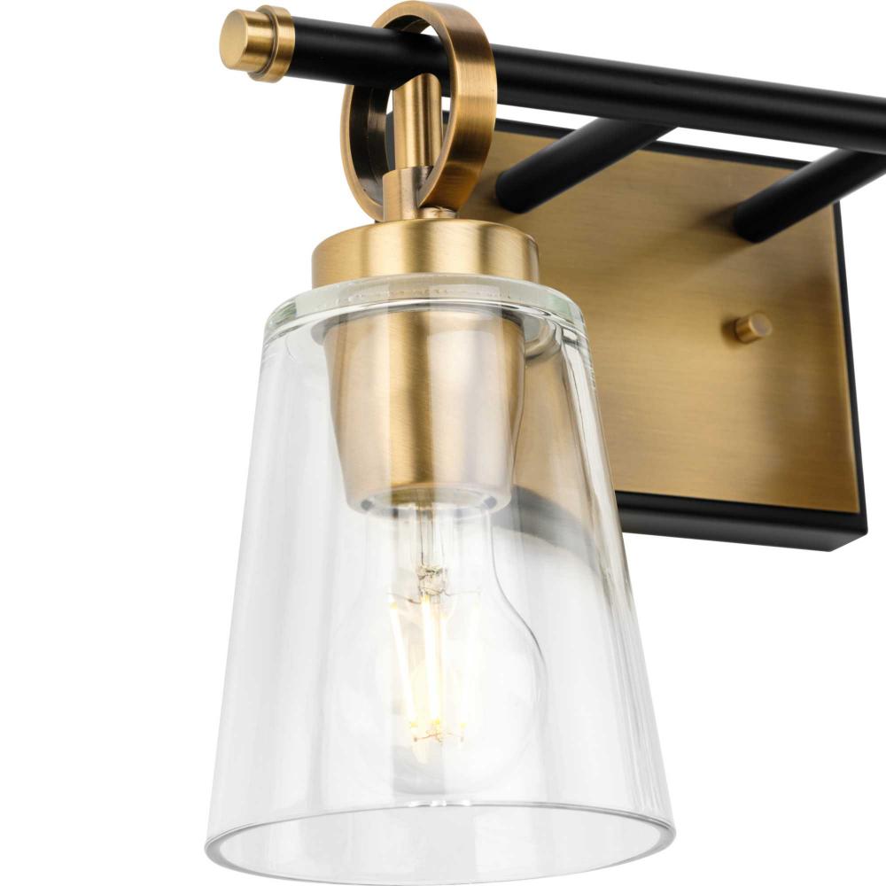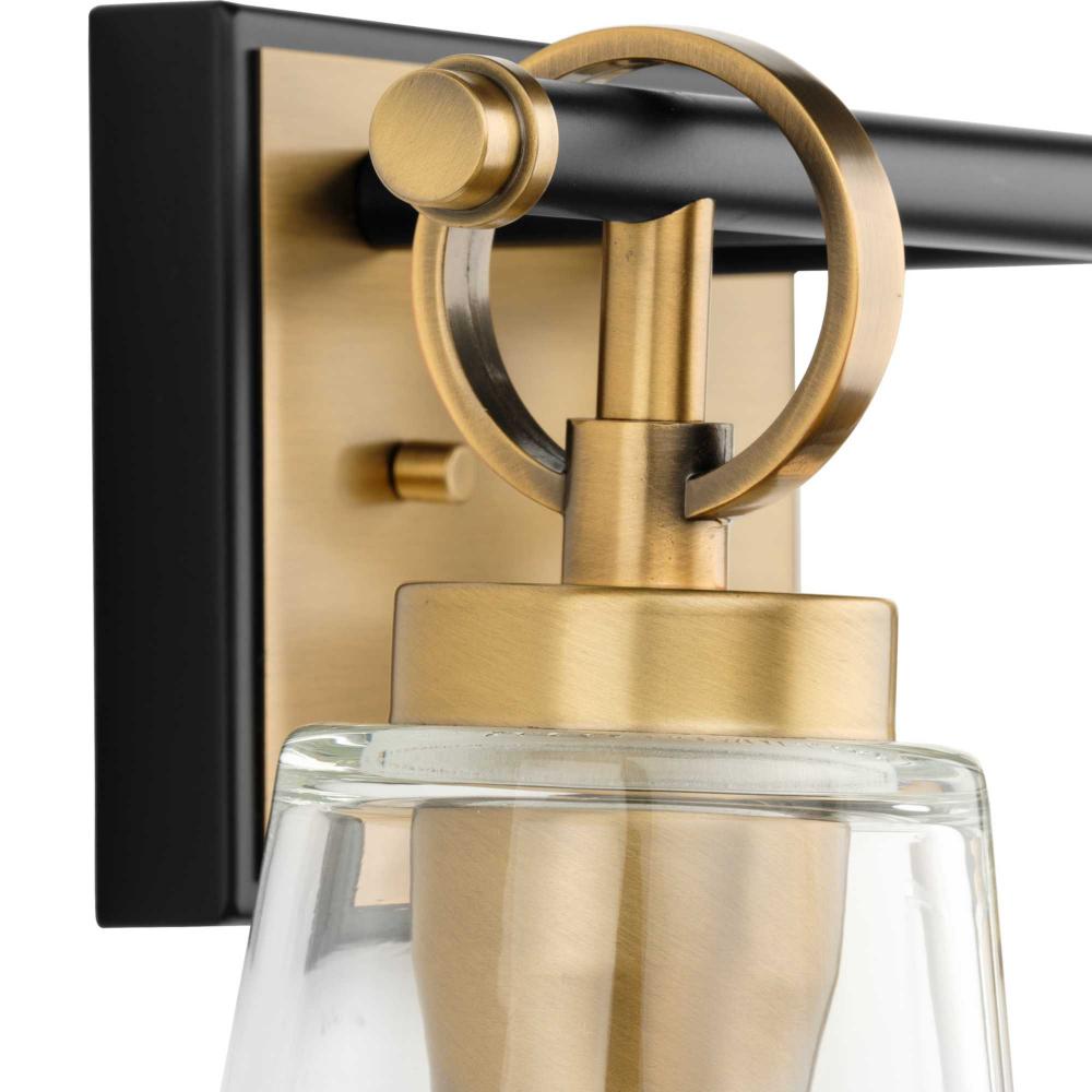 The Cassell Two-Light Vanity Fixture brings an enduring style to the bath. The light boasts a dual-tone finish of Vintage Brass and Matte Black that accentuates its distinguished and handsome design. Tailored details smoothly blend linear precision with elegant circular rings and clear glass shades.