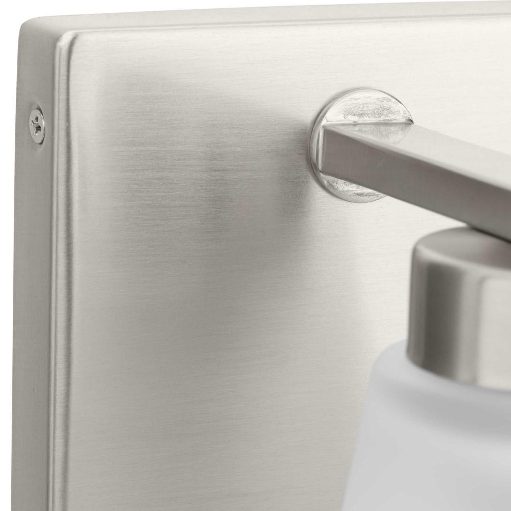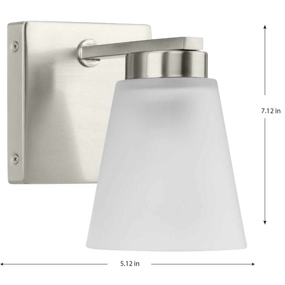 Fill your house with the lively Tanner family of fixtures. Strong lines accent the Brushed Nickel frame in a simple balance of form and function, while a soft etched glass shade complements the design. The versatile fixture can be mounted with the shade facing up or down to suit your preference.