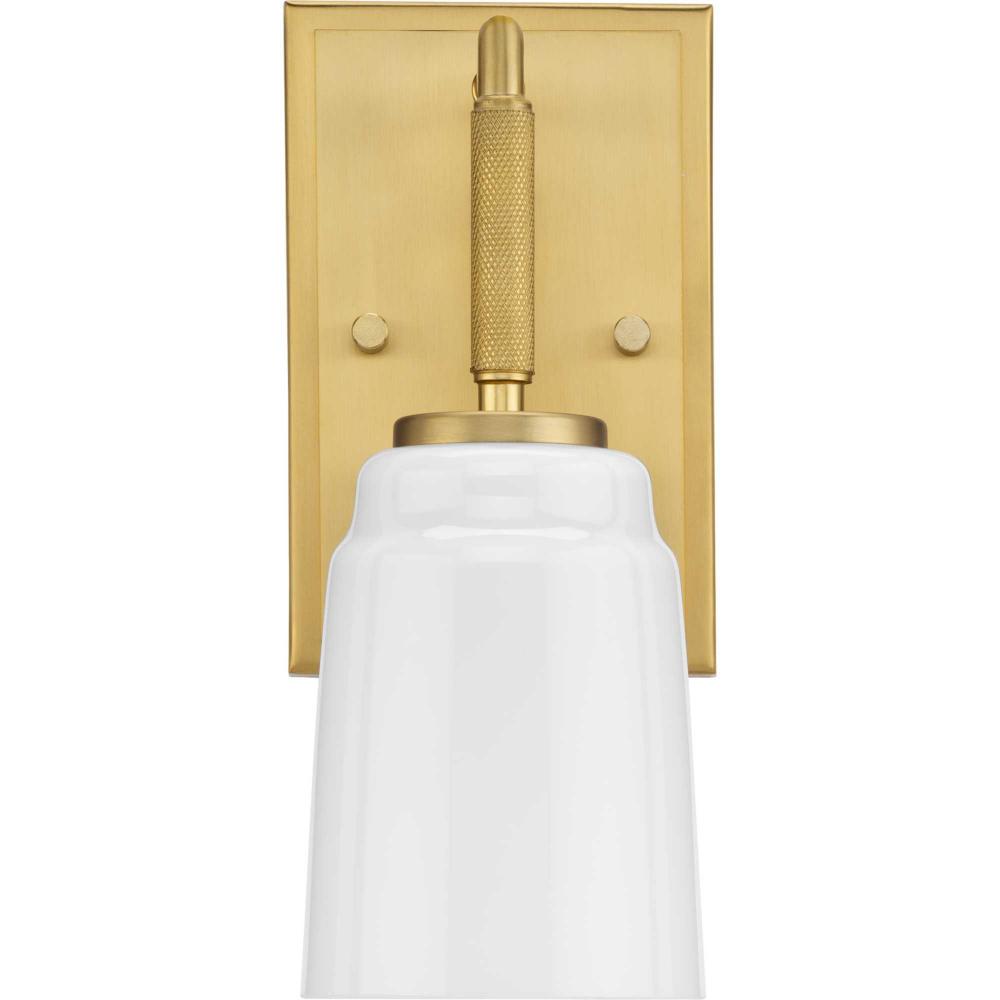 The Spenser vanity light has a streamlined design finished in luxe Brushed Gold contrasted by machined industrial-styled knurling. A rounded opal glass shade soften the fixture’s industrial look. The versatile fixture can be mounted with the shade facing up or down to suit your preference.