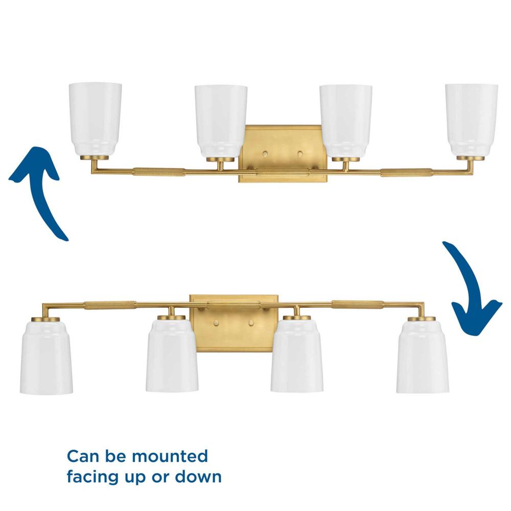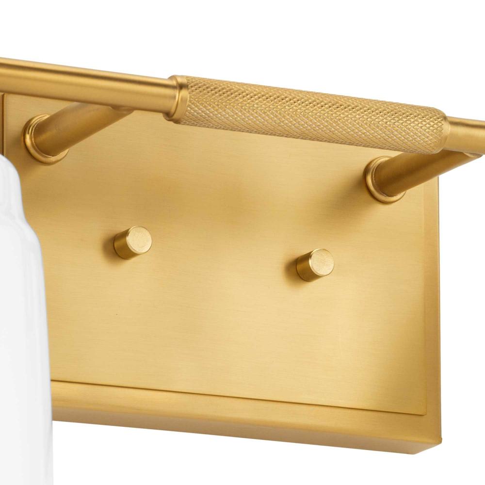 The Spenser vanity light has a streamlined design finished in luxe Brushed Gold contrasted by machined industrial-styled knurling. Rounded opal glass shades soften the fixture’s industrial look. The versatile fixture can be mounted with the shade facing up or down to suit your preference.
