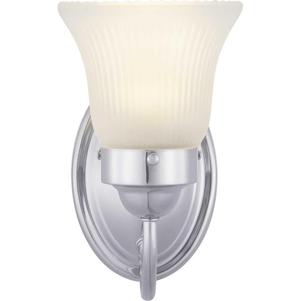 The one-light Fluted Glass Collection bath fixture features an etched glass shade that is nestled in a decorative ring extended by curving arms in a Polished Chrome finish. Timeless in its classic appeal, this light is stylish for both new and restored homes.