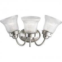 The three-light Fluted Glass Collection bath fixture features etched glass shades that are nestled in a decorative ring extended by curving arms in a Brushed Nickel finish. Timeless in its classic appeal, this light is stylish for both new and restored homes.