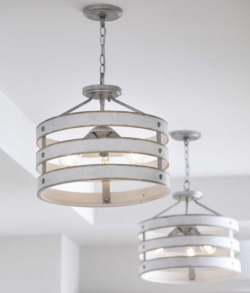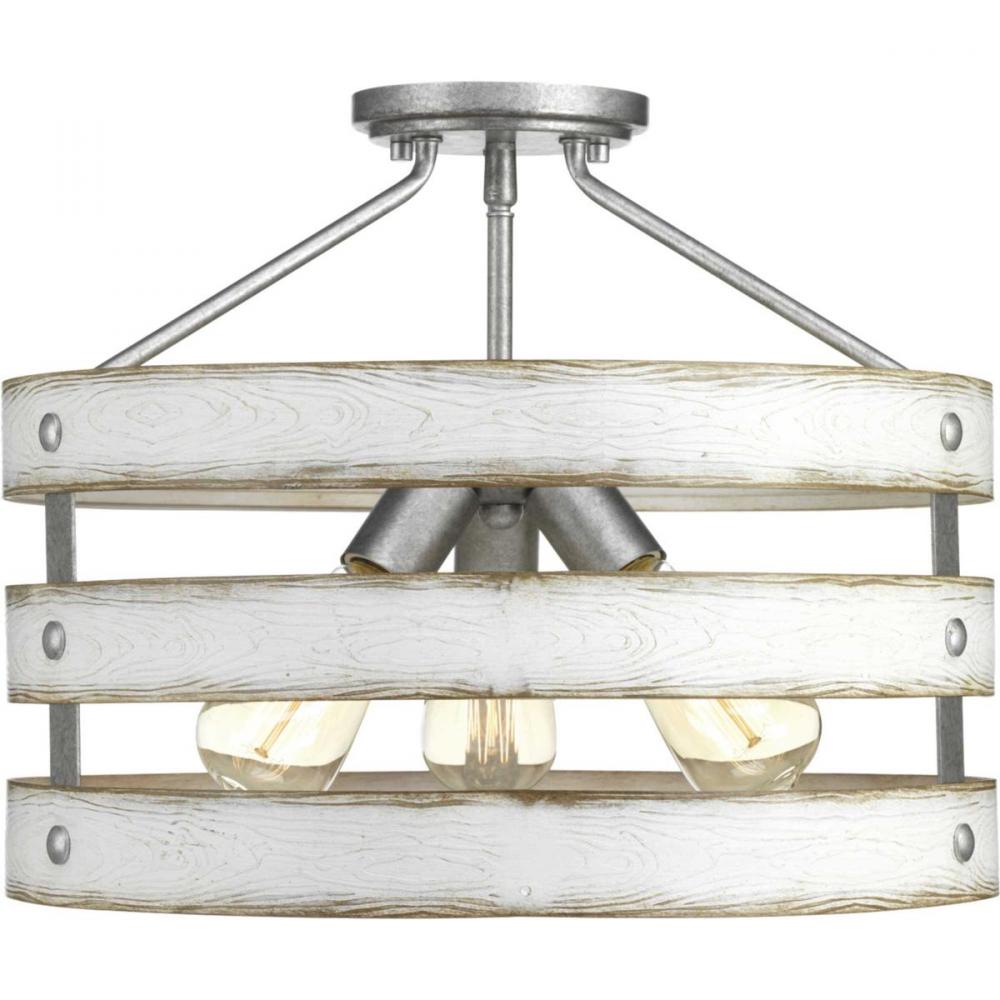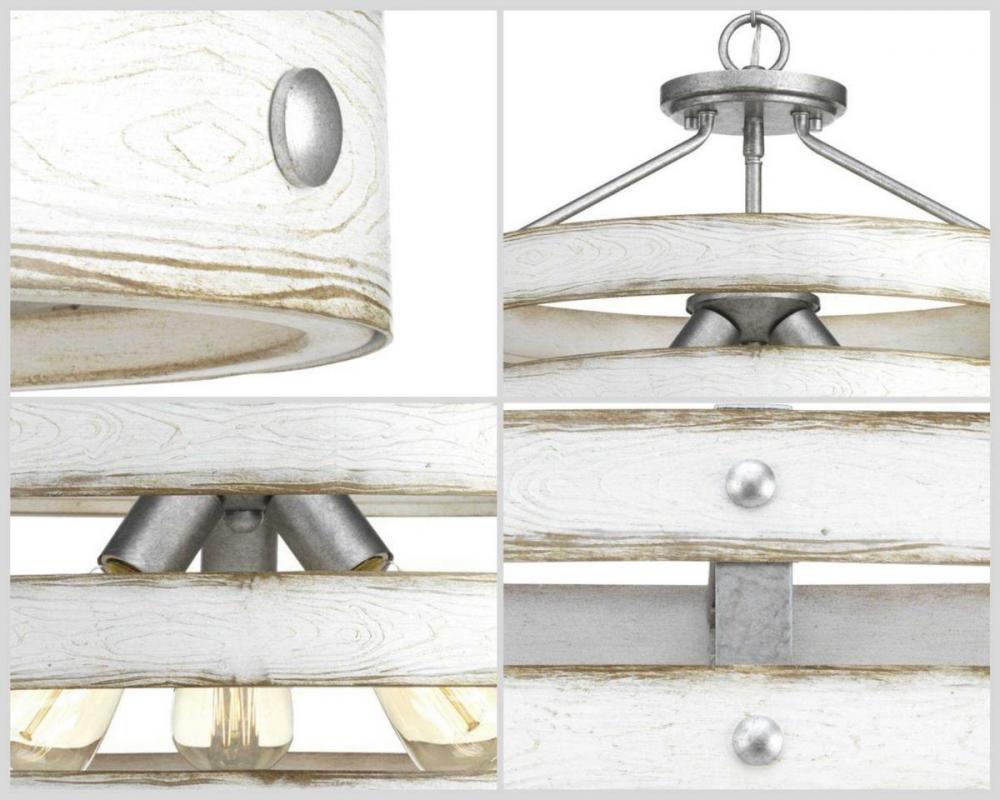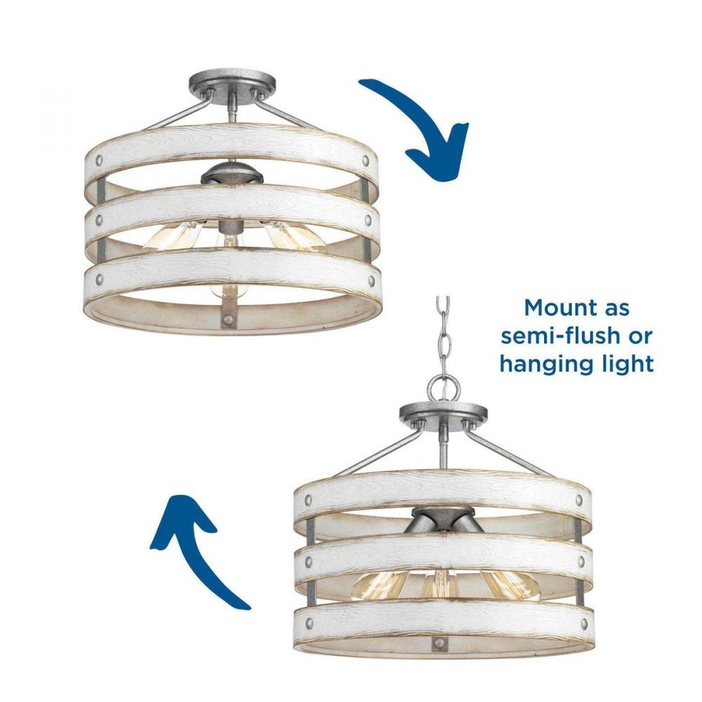 Semi-flush fixture convertible to hanging pendant with included hardware and instructions;Three circular bands wrap together to create an open design for Gulliver;Galvanized finish with hand painted antique white accents;Metal banding features embossed woo