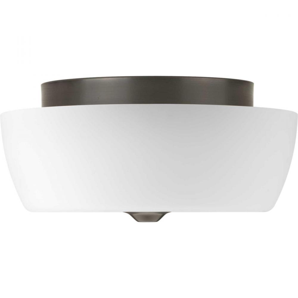 The Leap collection features etched glass shades that are slightly larger in scale to complement contemporary design trends. This two-light flush mount is finished in Antique Bronze.