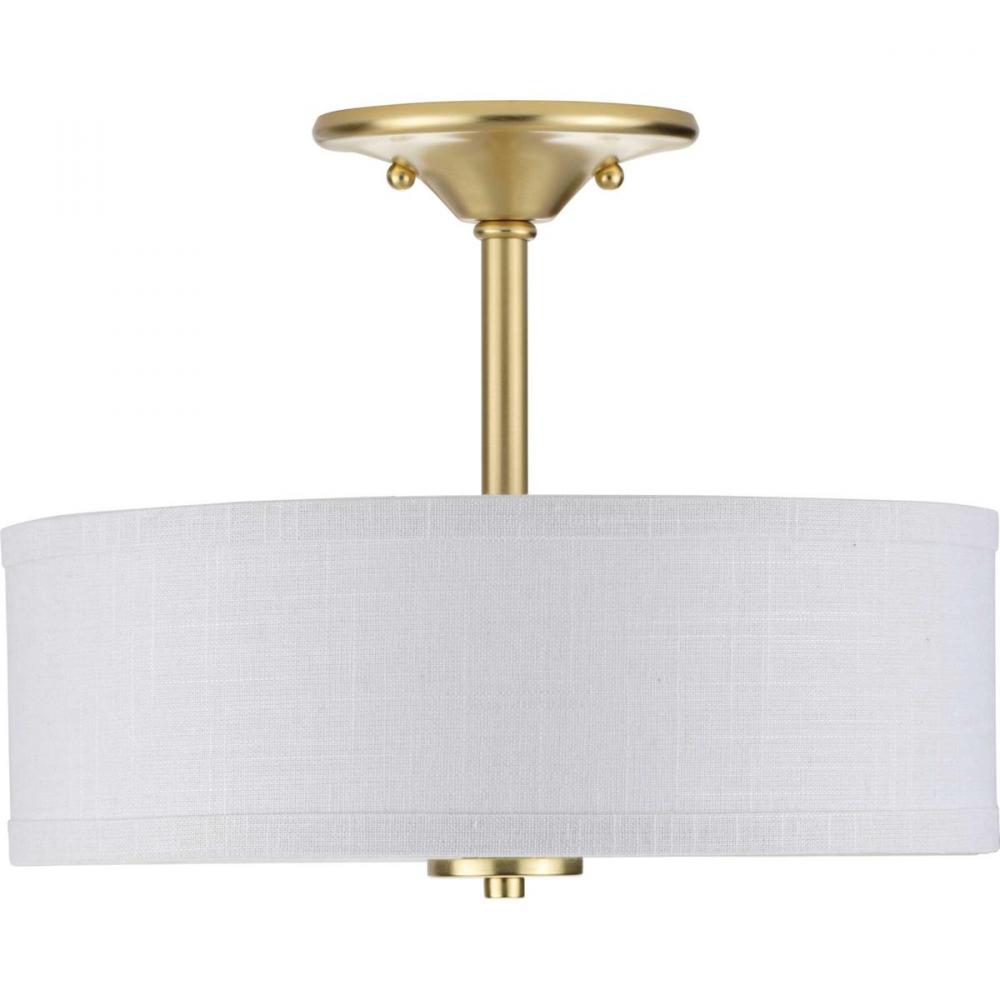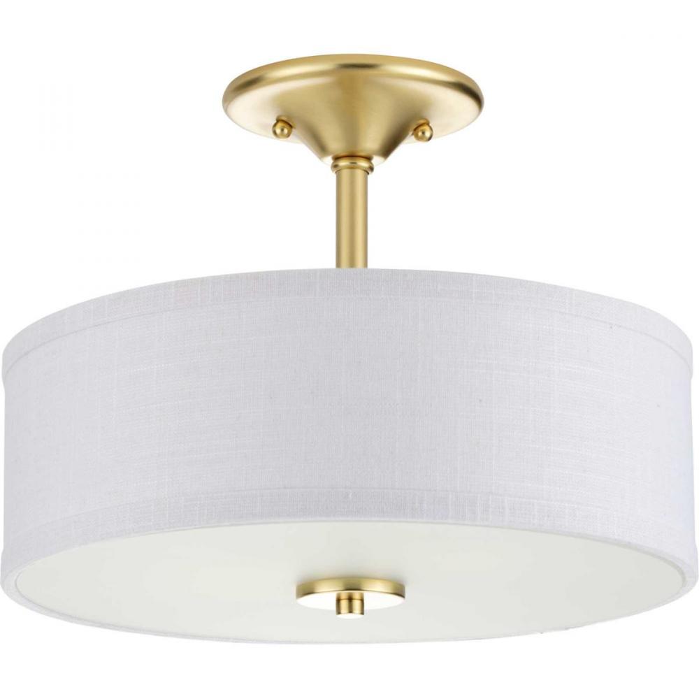 Harkening back to a simpler time, the Inspire Collection freshens traditional forms with flowing lines. An etched glass diffuser pairs with a Summer Linen shade for a clean design. The semi-flush mount's decorative knob, sleek stem, and circular ceiling plate are coated in a golden satin brass finish.